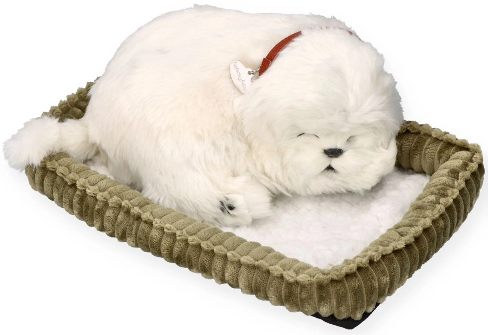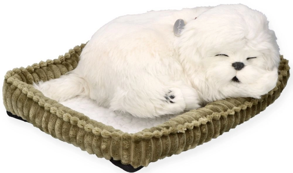 Un adorabile cucciolo di Maltese di PERFECT PETZZZ in una realistica posizione di sonno porta in ogni casa compagnia rassicurante e morbide carezze. Grazie al morbido pellicciotto in peluche e alla sua cuccia, è ideale come regalo per bambini dai 3 anni, come decorazione e come compagno per la nanna.