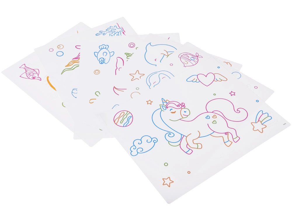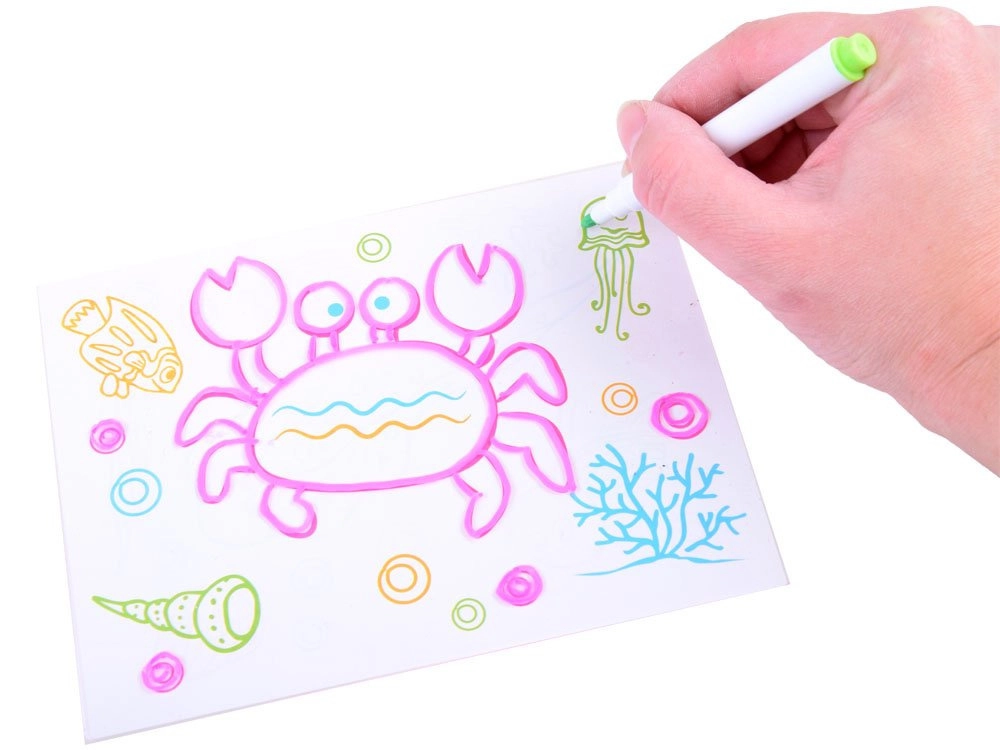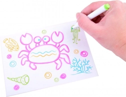 La superficie liscia si pulisce facilmente con il panno in dotazione, così puoi ricominciare a disegnare subito. Gli stencil bifacciali a tema marino aiutano i bambini a iniziare e a fare pratica con la mano.