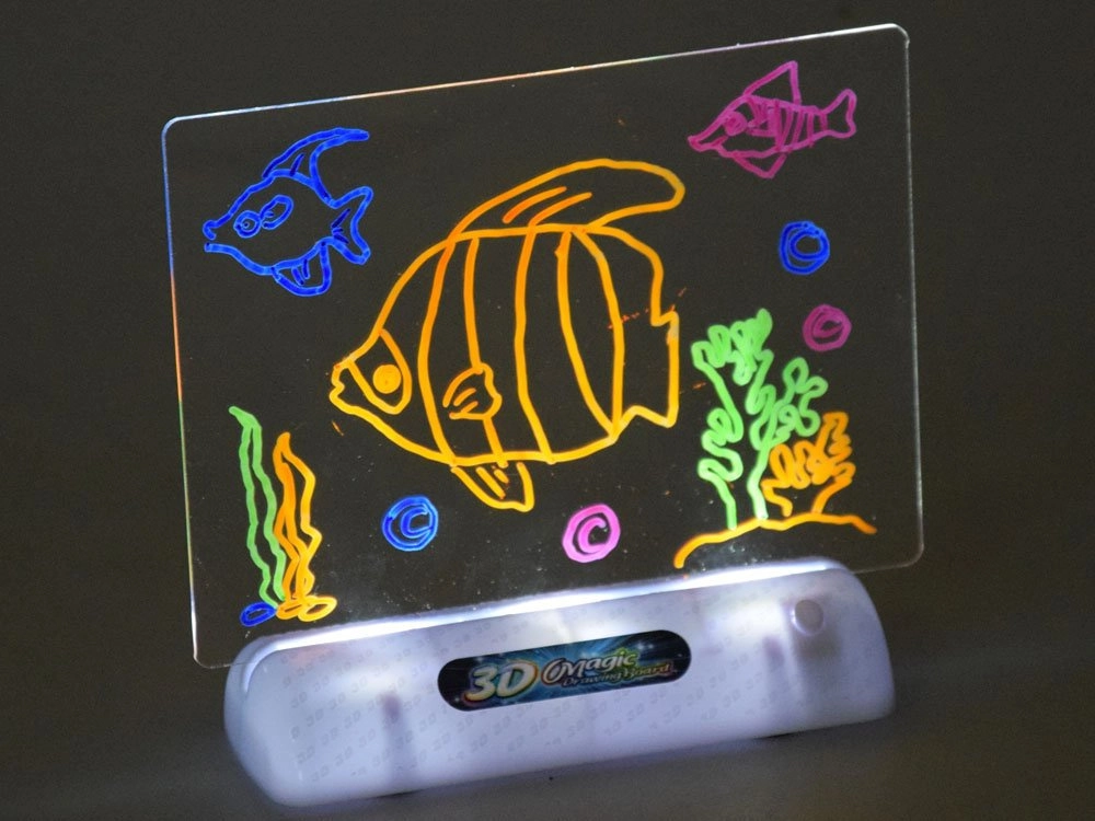 Questa magica lavagna da disegno 3D trasforma ogni idea in un’immagine luminosa. I bambini possono disegnare liberamente o ricalcare gli stencil inclusi: una volta indossati gli occhiali 3D, i disegni “prendono vita” e acquisiscono un meraviglioso effetto tridimensionale. La retroilluminazione LED esalta i colori neon e trasforma l’opera anche in una originale lucina notturna.