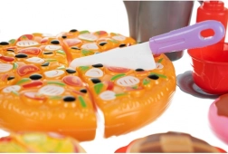 Le fette della pizza sono unite con velcro: i bambini possono separarle con il coltello di plastica e riassemblarle. Gioco realistico senza disordine, favorisce la motricità fine.