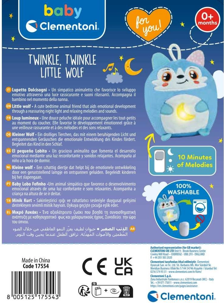 Il lupo di peluche interattivo Twinkle Twinkle è un ottimo compagno per un sonno tranquillo e una stimolazione giocosa. Una lucina soffusa e melodie delicate supportano la percezione uditiva e visiva, mentre la superficie morbida sviluppa il tatto e dona una sensazione di sicurezza. Grazie all’alta qualità e ai materiali certificati, è un gioco adatto ai neonati fin dai primi giorni.