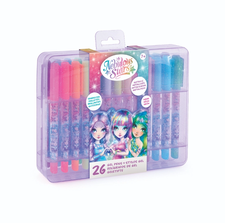 Scopri il mondo creativo con la valigetta Nebulous Stars piena di colori! Questo set completo include 26 penne gel tra cui glitter, metalliche, neon e una penna gel nera. Ideale per disegnare, scrivere diari, decorare biglietti e per progetti scolastici.