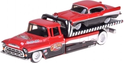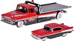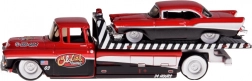 Il carro attrezzi CHEVROLET Flatbed 1957 è dotato di una rampa di carico dettagliata che riproduce fedelmente il trasporto di un’auto classica.
