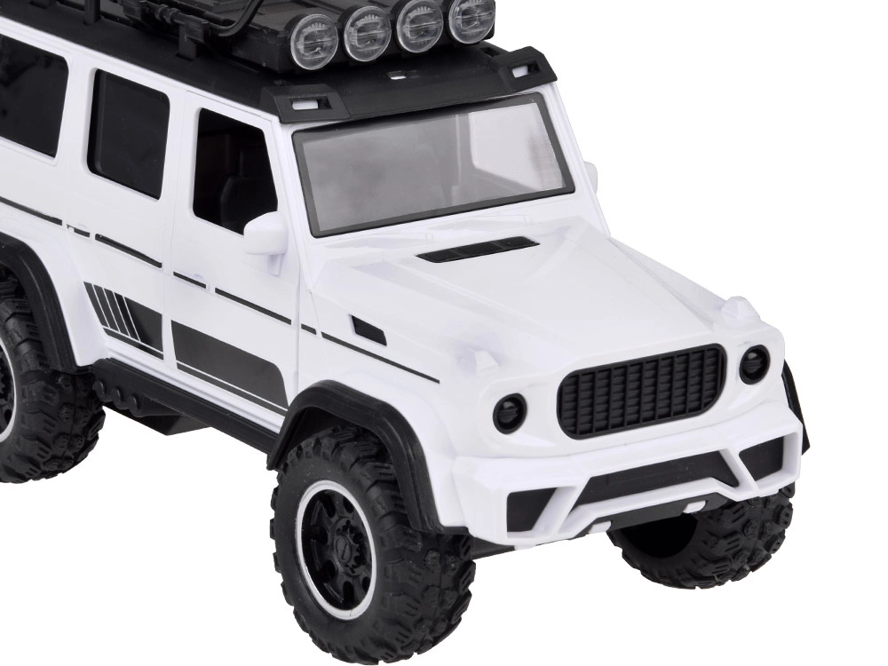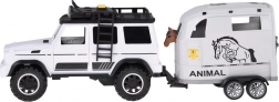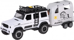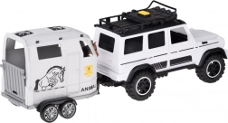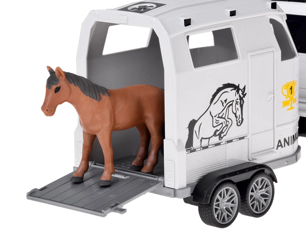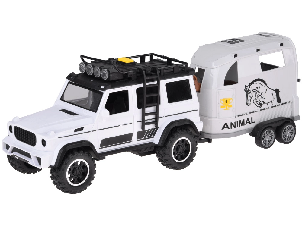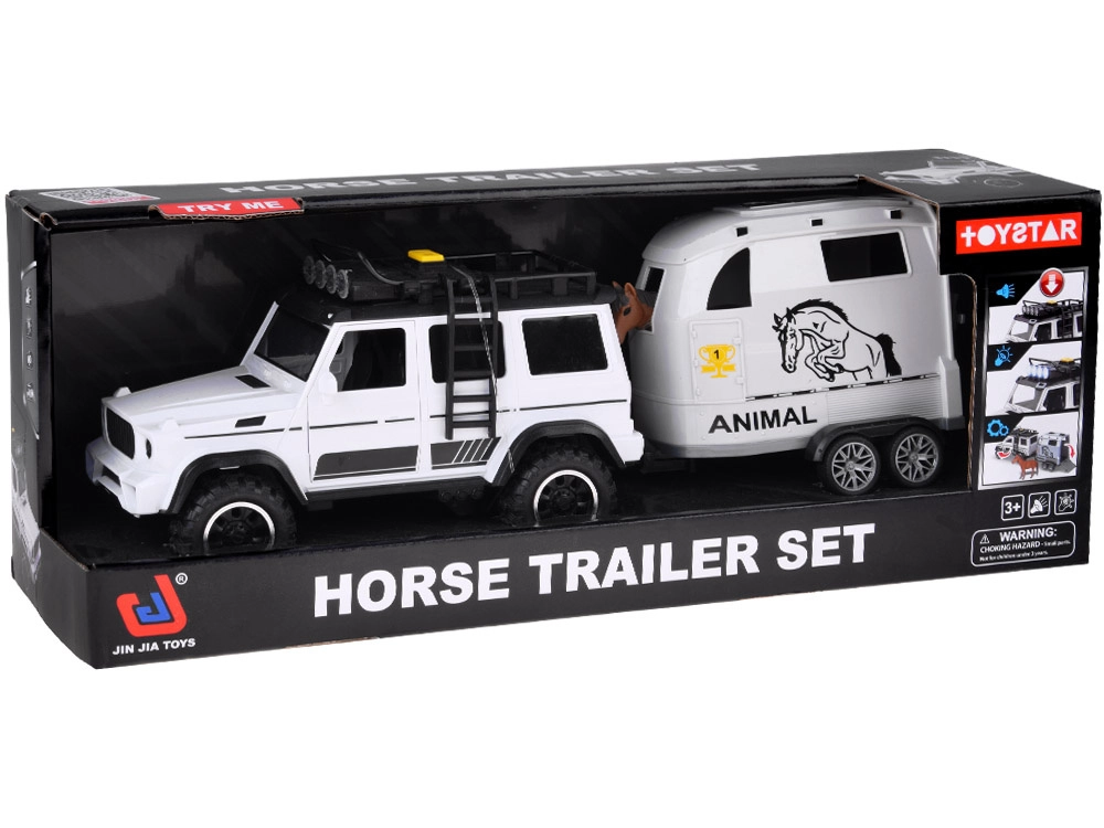 Scoprite un divertente set per i piccoli amanti delle auto e degli animali: fuoristrada bianco con rimorchio rimovibile per cavalli e una figurina di cavallo. Il veicolo ha porte apribili, ruote in gomma, effetti luminosi e sonori e gancio di traino. Il rimorchio offre una rampa posteriore ribaltabile e una scorrevolezza delle ruote per un gioco realistico.