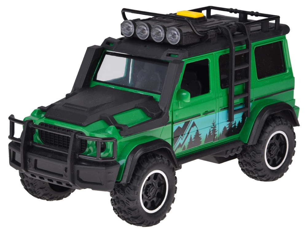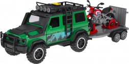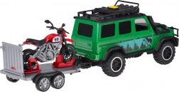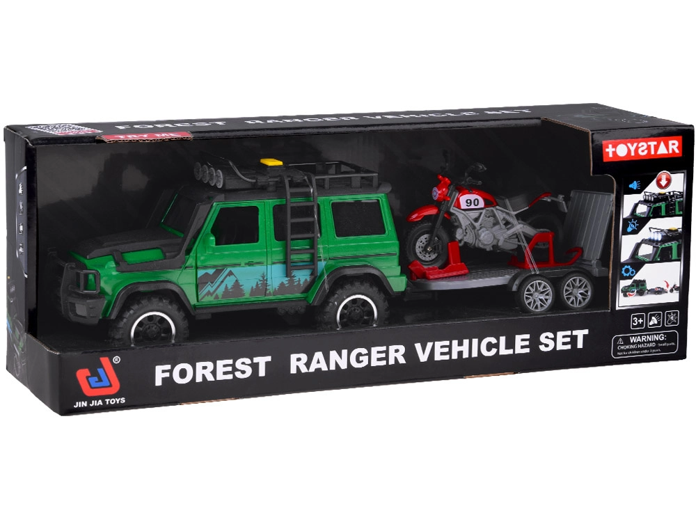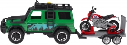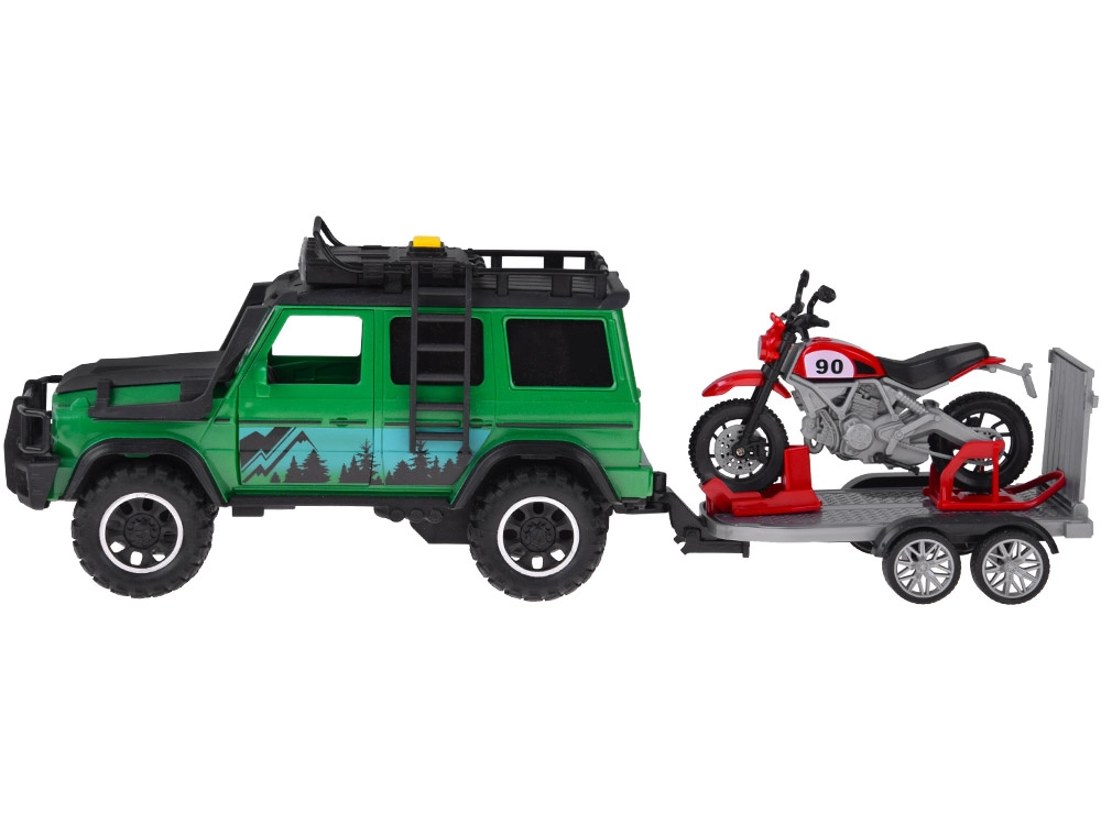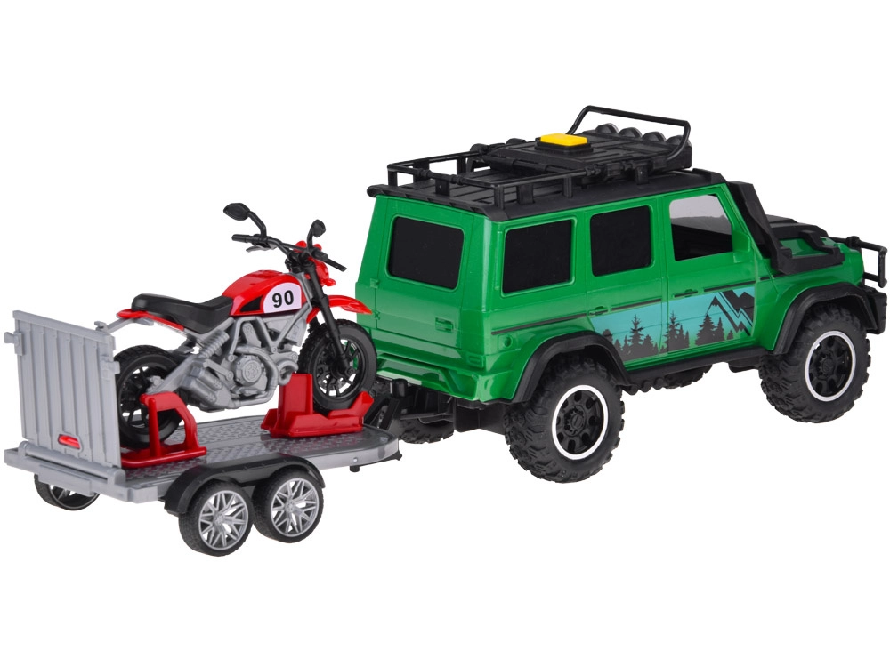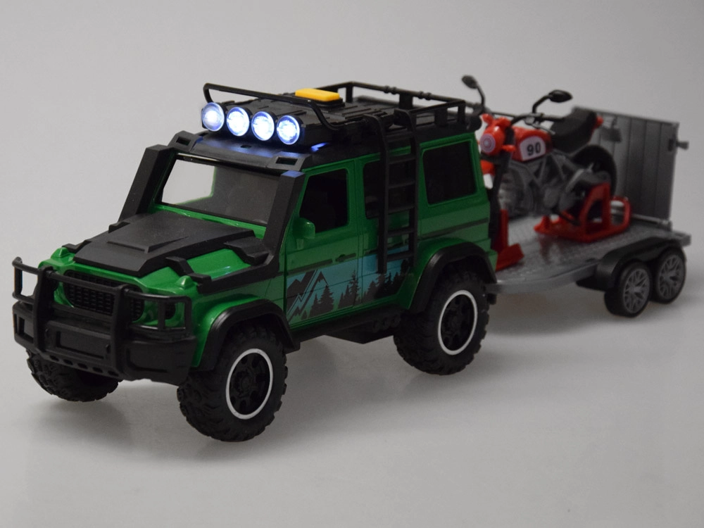 Parti all’avventura! Questo set dettagliato combina un SUV verde con pneumatici robusti e portapacchi sul tetto con un pratico rimorchio per il trasporto della moto. Le luci e i suoni realistici aumentano l’atmosfera, mentre le porte anteriori apribili e le ruote girevoli in gomma garantiscono tanto divertimento e scorrevolezza sul pavimento.