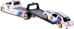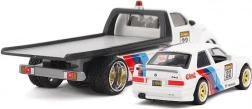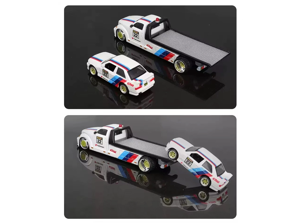 Il carro attrezzi dispone di rampa ribaltabile e piano di carico piatto, grazie ai quali è facile caricare e fissare la BMW M3 1988 – ideale per un gioco realistico o per l’esposizione.