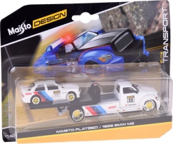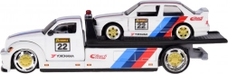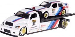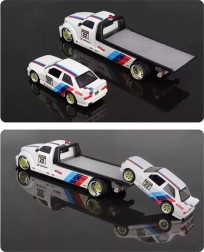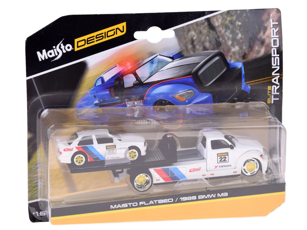 Questo set con licenza di modelli die‑cast in scala 1:64 unisce un carro attrezzi con piattaforma di carico e la cult BMW M3 1988. La livrea bianca coordinata con strisce da corsa, numeri di partenza e loghi degli sponsor enfatizza il carattere sportivo e l’attrattiva sia su scaffale sia durante il gioco.