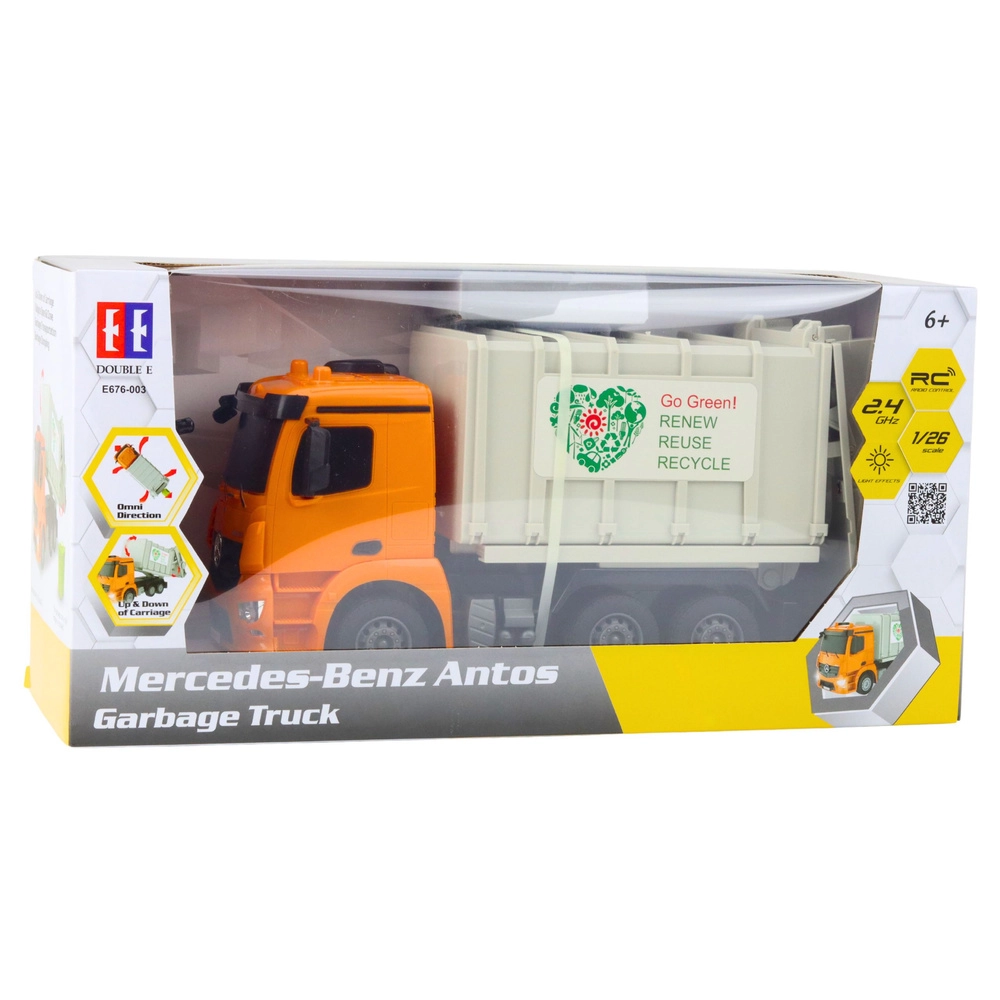 Scopri il mondo dei veicoli comunali con il modello dettagliato MERCEDES-BENZ ANTOS. Il camion RC dei rifiuti consente manovre complete avanti/indietro e sterzata, e offre funzioni autentiche – sollevamento del bidone, svuotamento e ribaltamento del cassone. Grazie alla velocità sicura fino a 3,6 km/h è ideale per il gioco in casa e all’aperto.