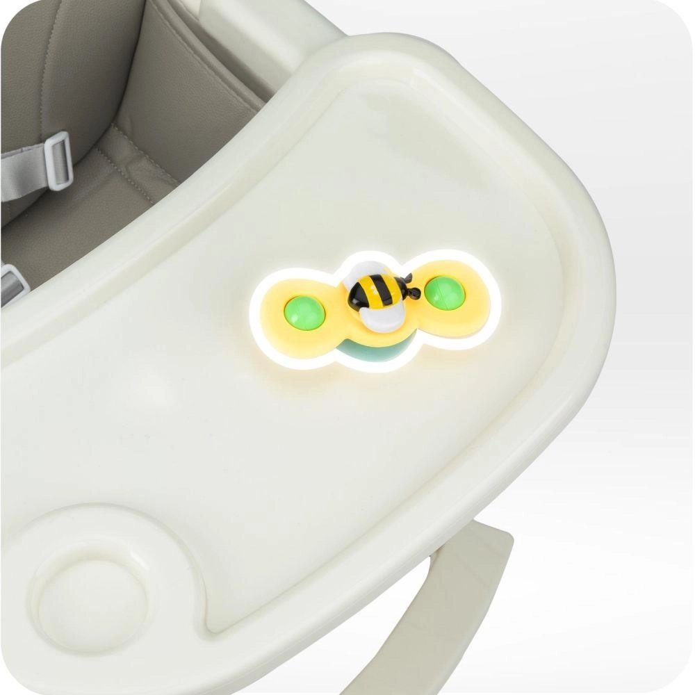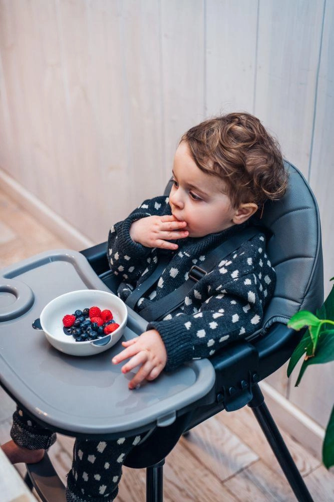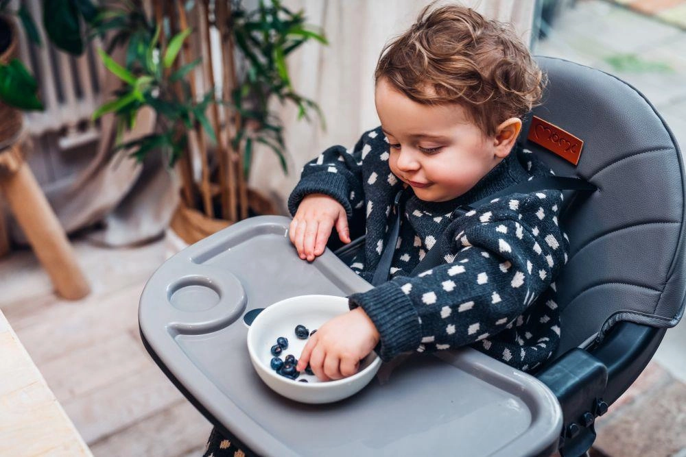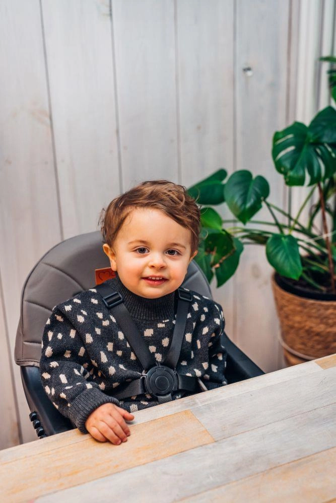 I dettagli pratici semplificano l’uso quotidiano: l’eco‑pelle si pulisce rapidamente, la parte superiore del vassoio è lavabile in lavastoviglie e il vassoio regolabile si adatta al bambino. La struttura stabile con poggiapiedi e cinture di sicurezza assicura una seduta confortevole e sicura.