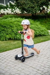 MoMi San è il primo monopattino ideale per piccoli rider dai circa 3 anni. Le tre ruote assicurano una stabilità eccellente, il peso ridotto di 2,7 kg facilita la maneggevolezza e il freno a pedale offre sicurezza in frenata. Grazie alle ruote LED la guida è non solo sicura, ma anche divertente.