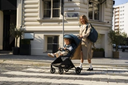 Il meccanismo autochiudente fa risparmiare tempo e spazio: il passeggino si chiude da solo alla pressione del pulsante e rimane stabile in piedi da chiuso.