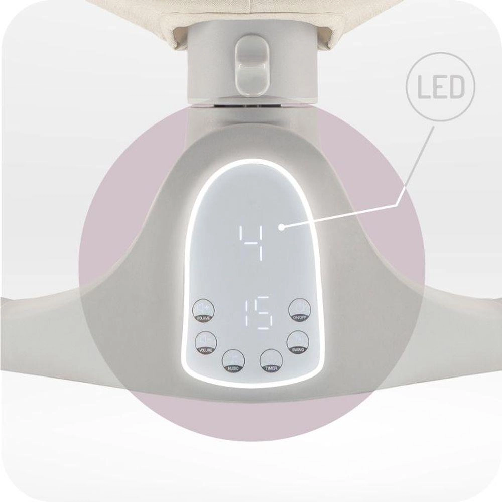 Il modulo Bluetooth integrato e le 10 melodie con volume regolabile creano un’atmosfera piacevole. La regolazione a cinque livelli dell’ampiezza del dondolio riproduce fedelmente il movimento naturale nel pancione della mamma e il timer da 8, 15 o 30 minuti aiuta a impostare la routine ideale della nanna. I piedini antiscivolo e le cinture a cinque punti garantiscono la massima sicurezza.