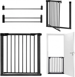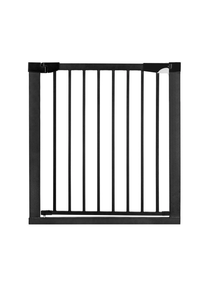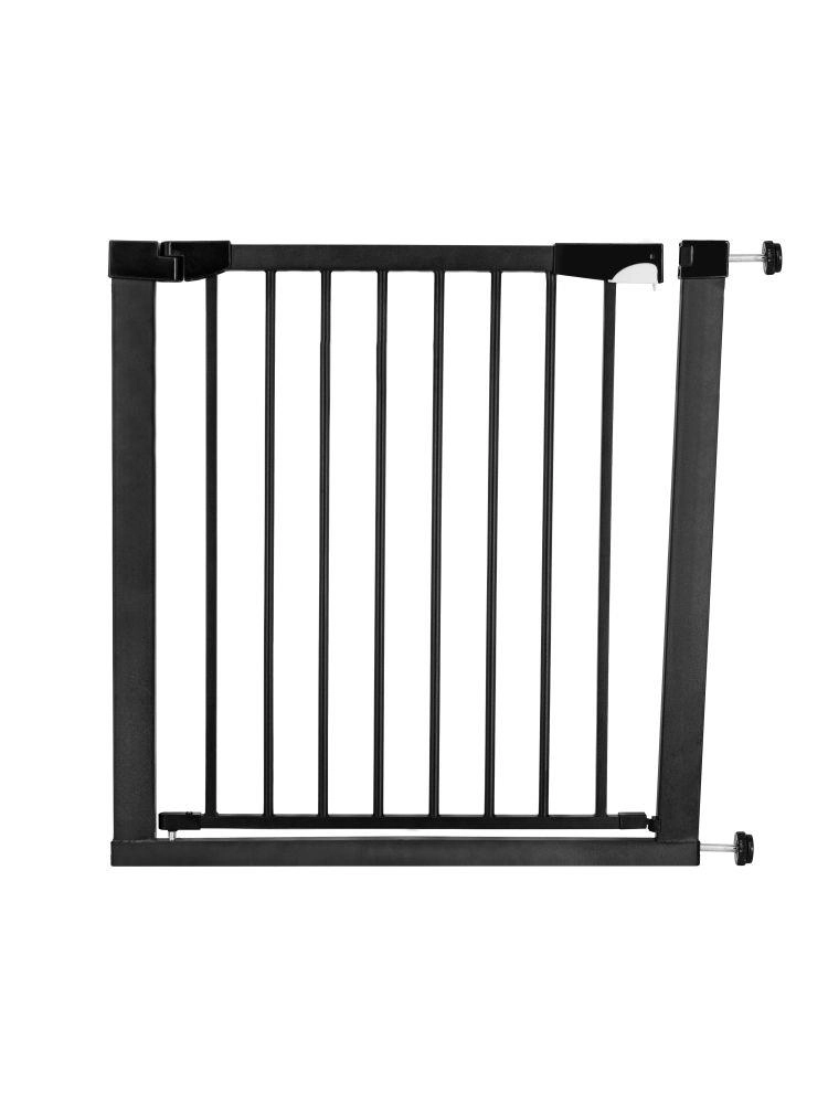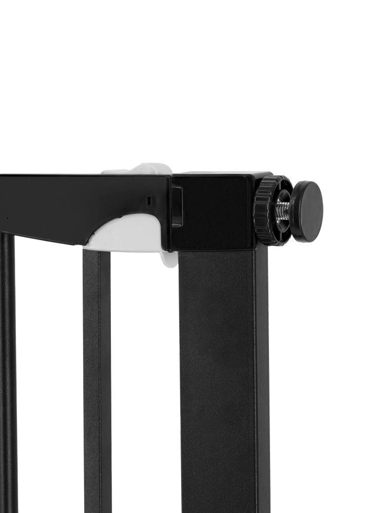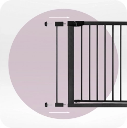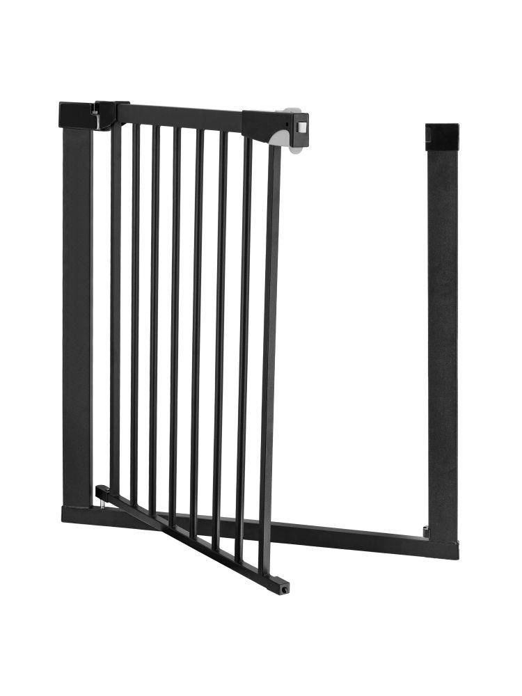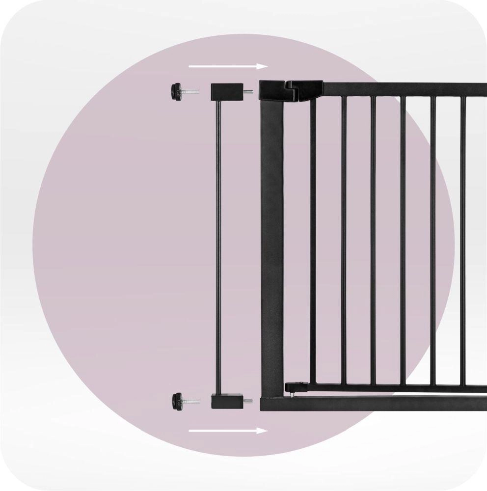 La larghezza di base è 75–82 cm e le prolunghe incluse da 7 cm e 14 cm permettono di arrivare fino a 103 cm. Il cancelletto si apre in entrambe le direzioni, ha una pratica funzione di blocco e, aperto a 90°, rimane spalancato per un passaggio agevole. Il doppio sistema di chiusura impedisce ai bambini di aprirlo autonomamente.