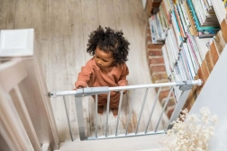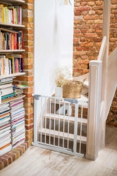Il doppio meccanismo di sicurezza impedisce ai bambini di aprirlo. Il cancelletto si apre in entrambe le direzioni e rimane aperto a 90° per un passaggio senza ostacoli.