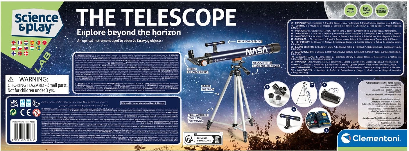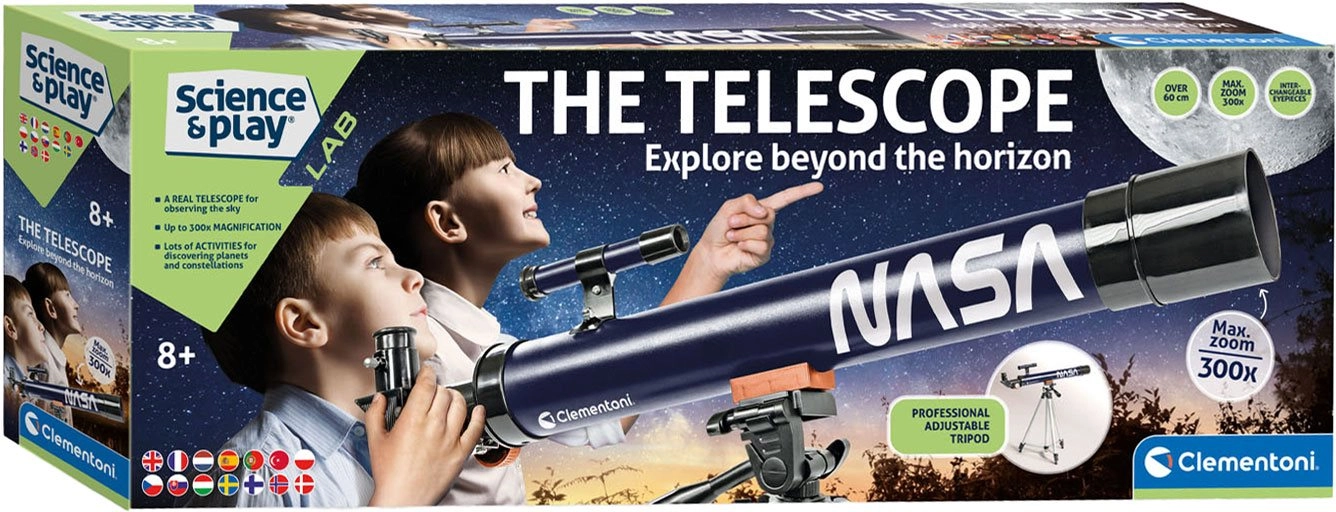 Esplora il cielo notturno con il telescopio per bambini CLEMENTONI della serie Science & Play. Questo telescopio astronomico di qualità è ispirato alla NASA e offre ingrandimento 50× fino a 100×, completato da una lente di Barlow per un ingrandimento triplo. Grazie all'obiettivo da 50 mm e al robusto treppiede fino a 130 cm è ideale per le prime osservazioni della Luna, delle stelle e dei pianeti. Incluso un manuale illustrato che spiega ai bambini le basi dell'astronomia. Adatto da 8 anni, un'ottima giocattolo STEM per apprendimento e divertimento.