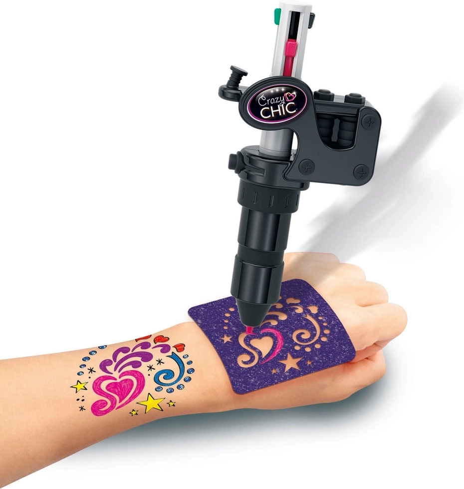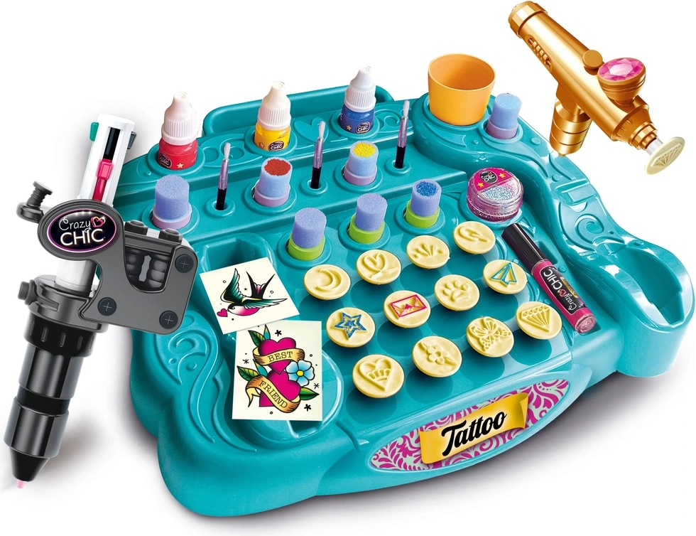 Scopri il mondo dei tatuaggi temporanei con il set creativo Crazy Chic. Il kit offre tutto il necessario per creare motivi originali – a mano libera, con stencil e con timbri. Grazie ai diversi colori, ai glitter e alla facilità d’uso, realizzare i tatuaggi è divertente, sicuro e pieno di creatività.