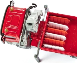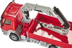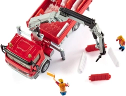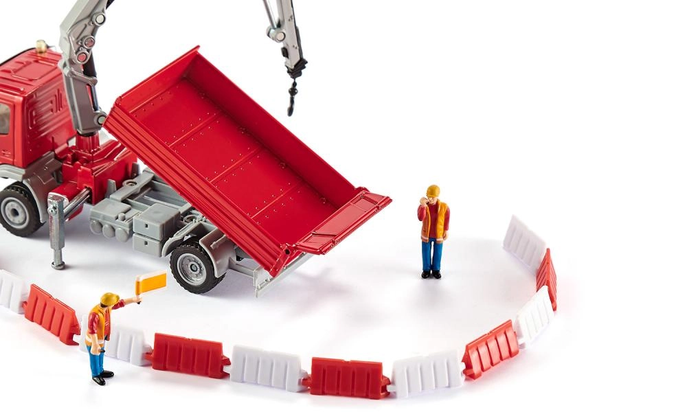 Il modello offre numerose funzioni: gru girevole e snodata con gancio, cassone ribaltabile per carico/scarico e puntelli stabilizzatori estensibili per sollevare i carichi in sicurezza. Le ruote in gomma scorrono senza sforzo su diverse superfici e gli accessori, come figurine e barriere, ampliano le possibilità di gioco e stimolano la fantasia.