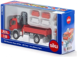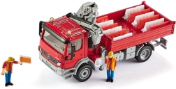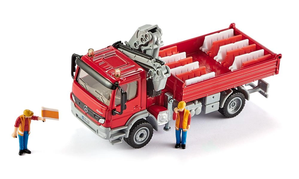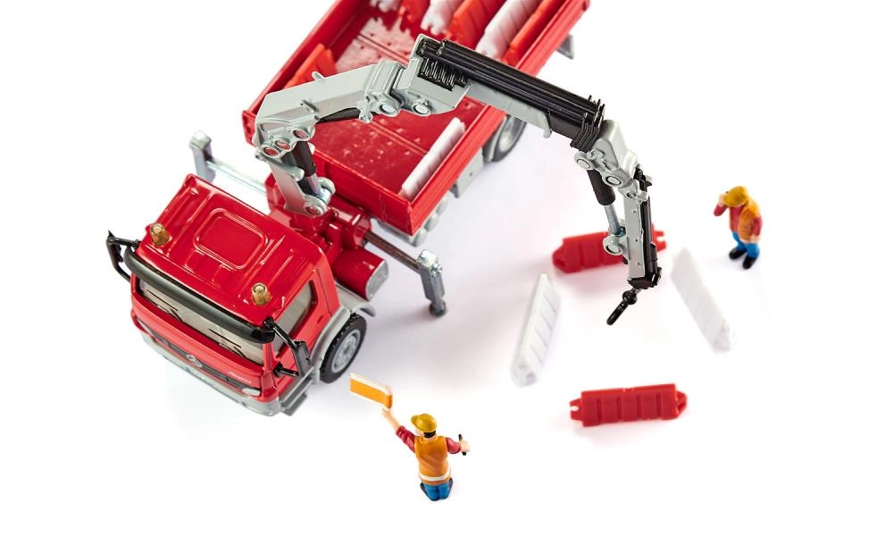 Modello realistico del camion Mercedes Atego di SIKU in scala 1:50, affascina per la lavorazione dettagliata, la combinazione di metallo e plastica e gli elementi funzionali. La gru girevole, il cassone ribaltabile, i puntelli estensibili e le ruote in gomma garantiscono un gioco fluido e lunga durata. La confezione include figurine di operai e blocchi stradali per scenari di costruzione creativi.