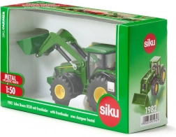 Modello di trattore JOHN DEERE con caricatore frontale in scala 1:50 del marchio SIKU, realizzato in metallo e plastica per resistenza e lunga durata. Offre braccio mobile con benna inclinabile, ruote sterzanti con pneumatici in gomma e cabina rimovibile per un gioco realistico e per l’esposizione da collezione.