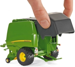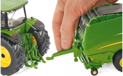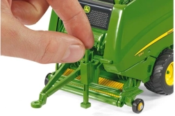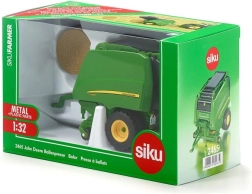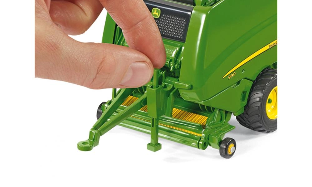 Modello dettagliato della pressa per balle rotonde JOHN DEERE 990 del marchio SIKU in scala 1:32, ideale per piccoli e grandi appassionati di macchine agricole. La combinazione di metallo e plastica garantisce robustezza, le parti mobili offrono un gioco realistico e la compatibilità con Siku Farmer 1:32 assicura un facile aggancio al trattore. Inclusi anche un ballone di fieno e pneumatici in gomma con battistrada autentico per un movimento fluido.