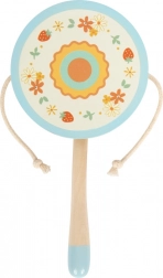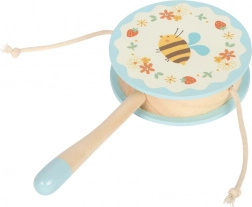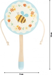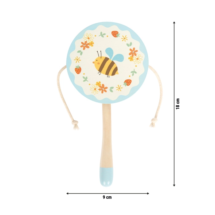 Questo tamburo rotante in legno è lo strumento musicale ideale per i piccoli musicisti. Grazie alle dimensioni compatte si adatta perfettamente alla mano del bambino e durante il gioco supporta lo sviluppo naturale del senso del ritmo e della coordinazione occhio–mano. La stampa allegra con ape e fiori dona al giocattolo un aspetto giocoso che motiva i bambini a esplorare ulteriormente il mondo dei suoni.