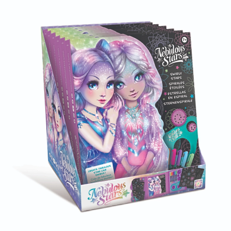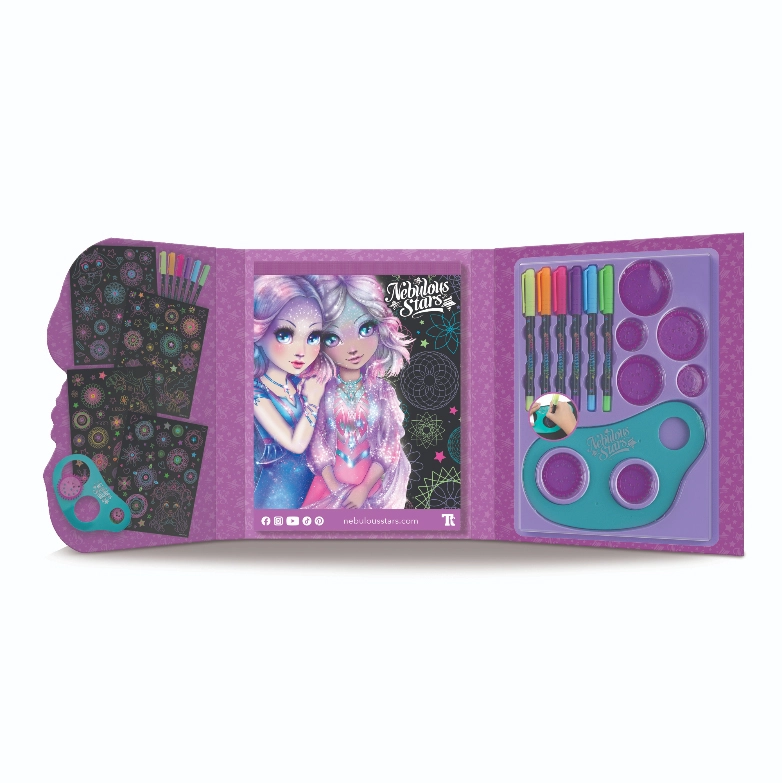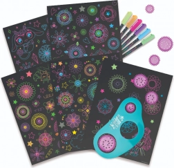 Scopri la magia del disegno con il set Nebulous Stars per creare spirali stellari. Il set include 48 pagine nere, una dima a spirale con 7 rotelle, 6 penne gel neon e adesivi per un divertimento creativo senza fine. Su 36 pagine illustrate puoi colorare e arricchire spirali luminose – ideale per sviluppare creatività e motricità fine.