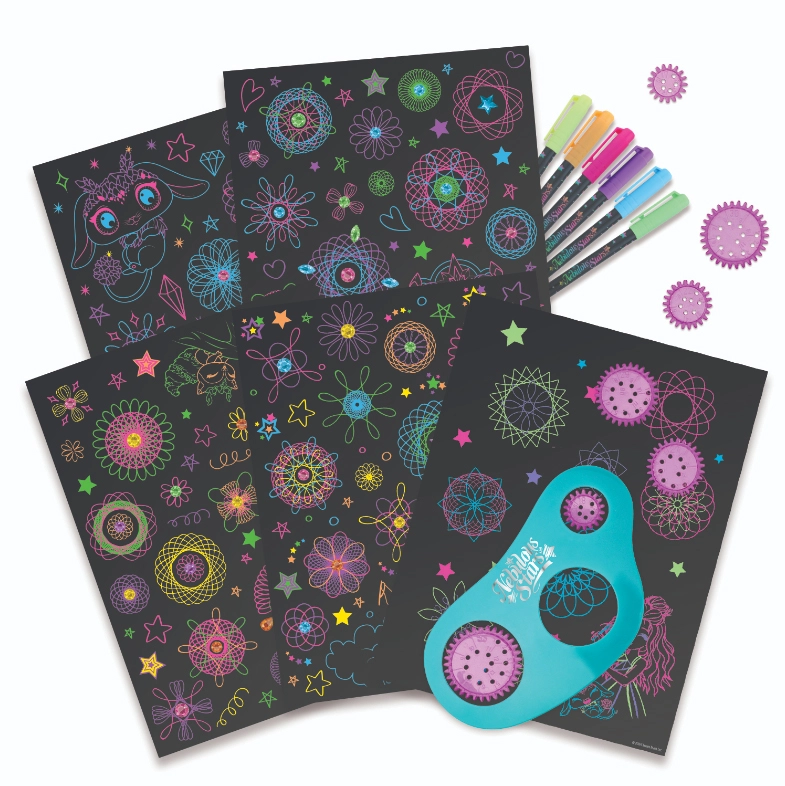 - Facile e divertente – inserisci la rotella nella dima, disegna con la penna neon e guarda prendere forma affascinanti spirali.