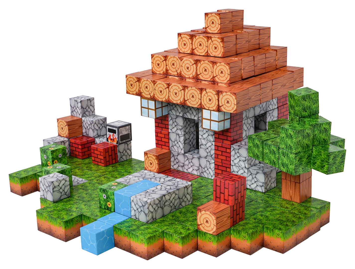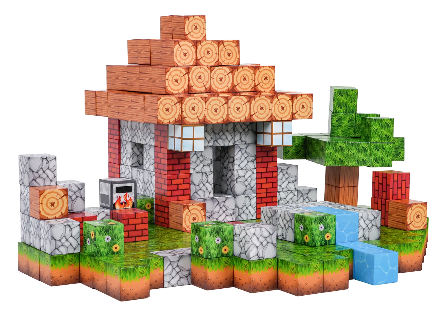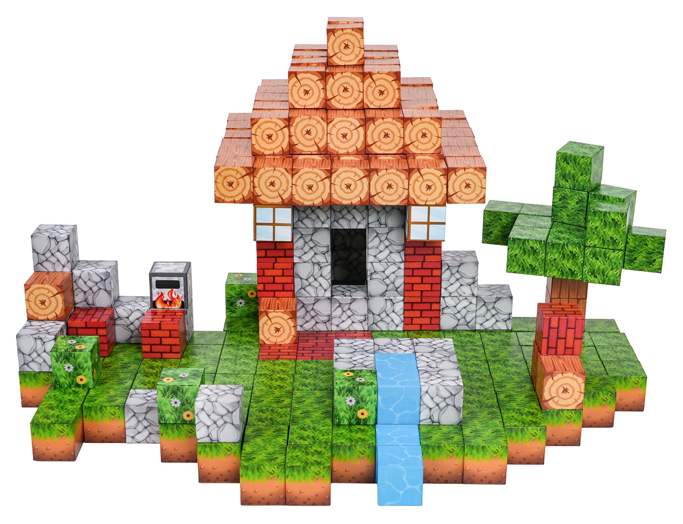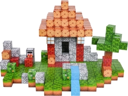 L’alto numero di blocchi con diverse stampe consente di comporre scenette variegate: dalla casetta con giardino al ruscello fino al paesaggio pixelato.