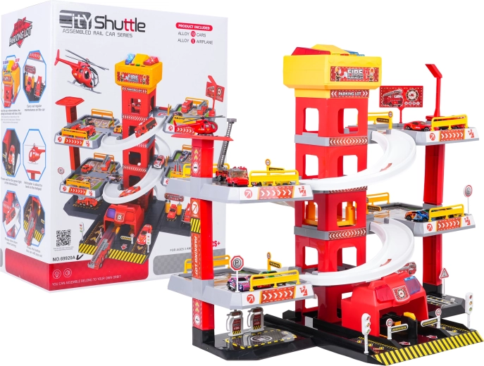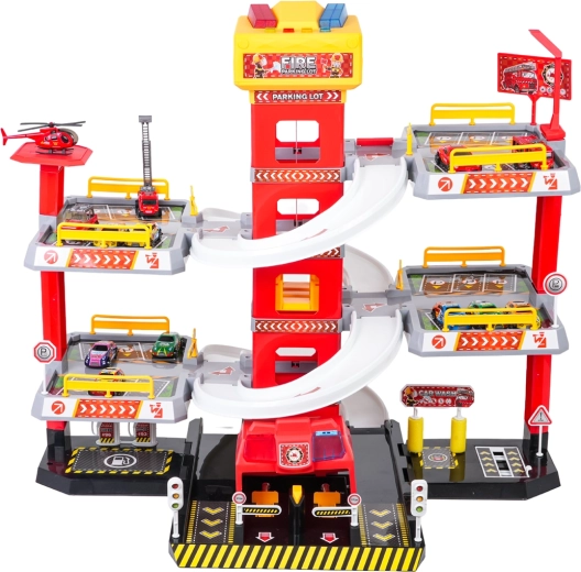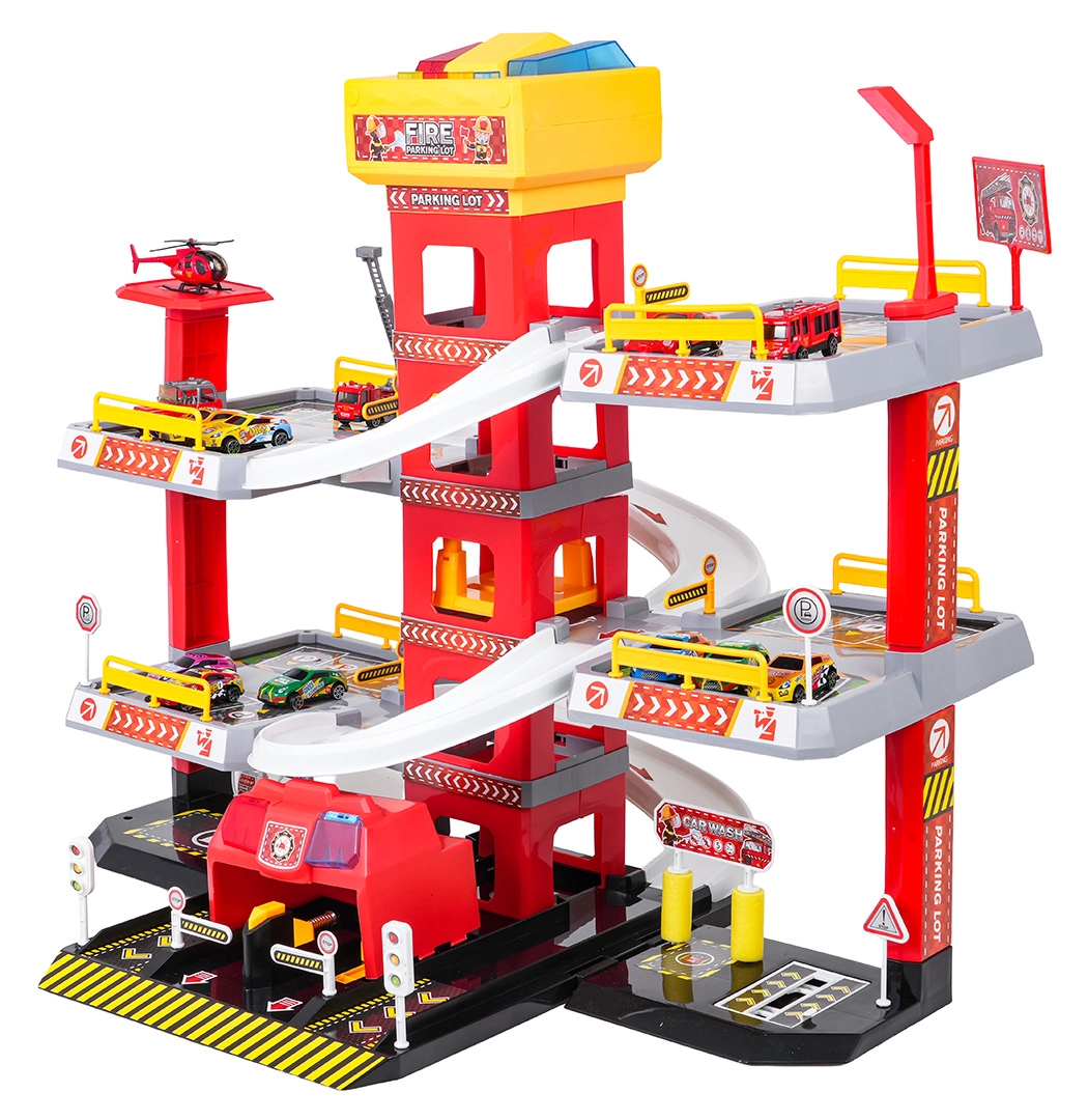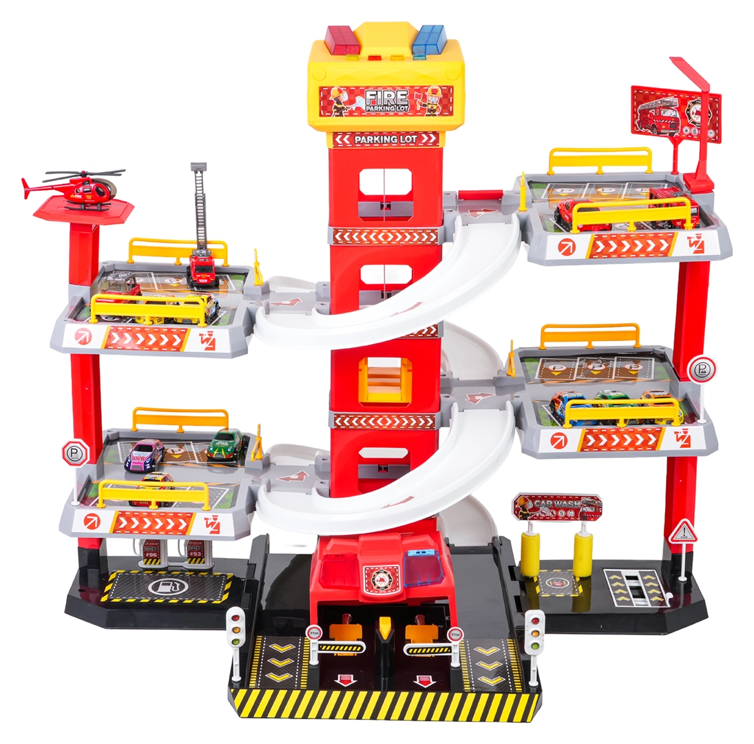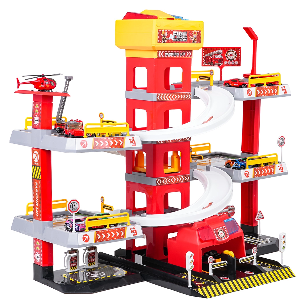 Questo grande parcheggio dei pompieri a 3 piani offre ai bambini un gioco realistico e dinamico. Grazie alla torre centrale con ascensore, le macchinine possono spostarsi comodamente tra i piani o sfrecciare giù lungo le rampe curve. Il pannello superiore dell’ascensore è dotato di grandi pulsanti per il controllo su/giù e di quattro pulsanti più piccoli per gli effetti: suoni di avviamento, retromarcia, accelerazione, frenata e melodia, il tutto accompagnato da luci lampeggianti.