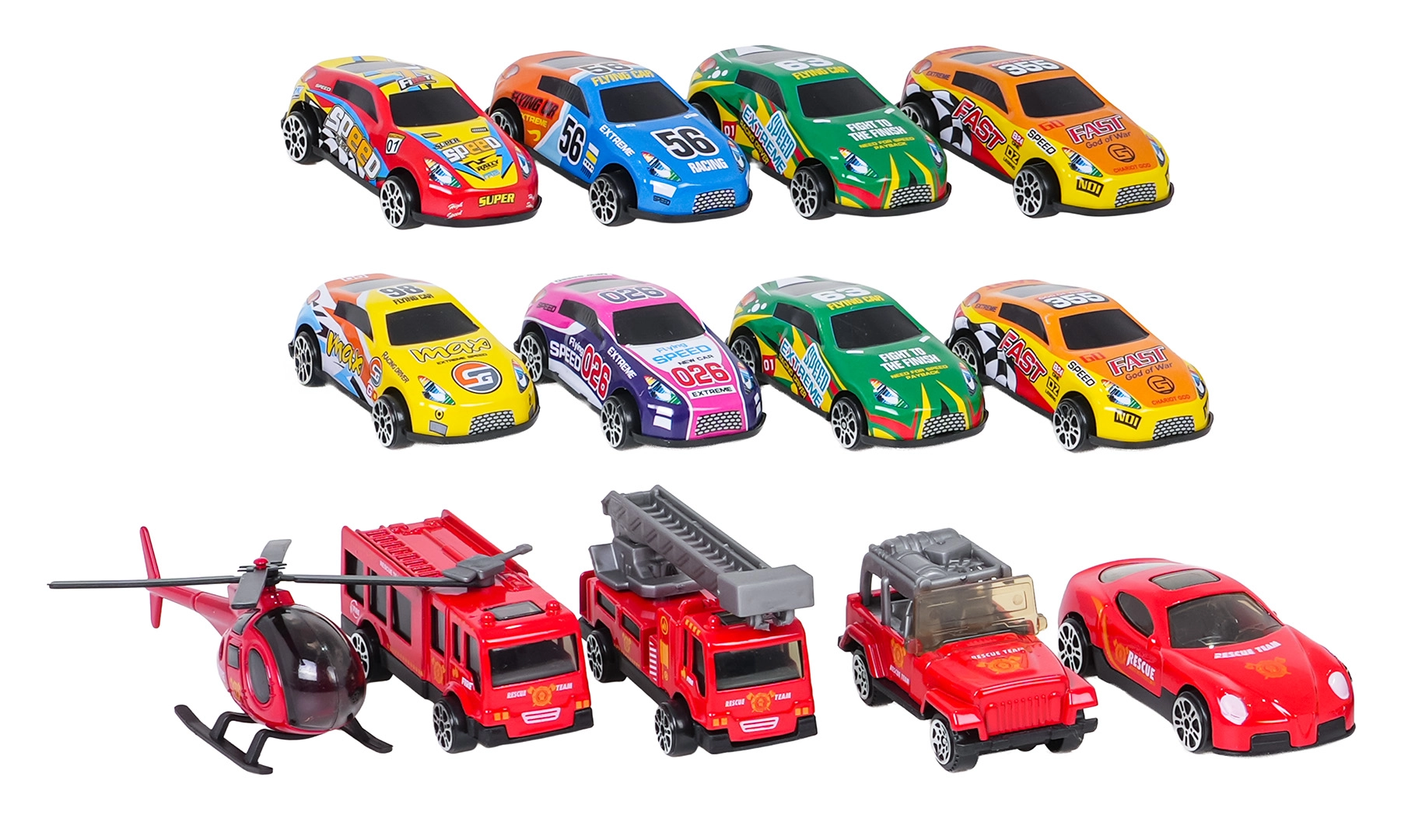 Nella confezione trovi 12 diverse macchinine, un elicottero con piazzola di atterraggio, segnali stradali, barriere e adesivi decorativi.
