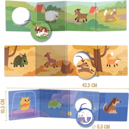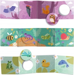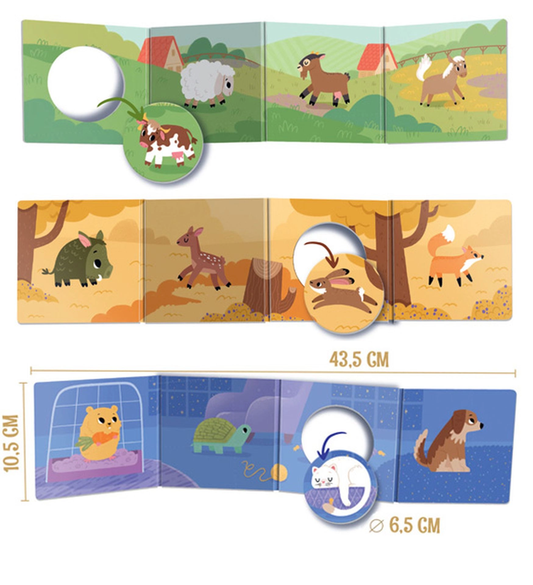 Il set di tre leporelli bifacciali presenta sei ambienti diversi (ad es. prato, bosco, pascolo, acqua o casa), nei quali i bambini scoprono in totale 24 animaletti. Grazie alle finestrelle circolari e ai gettoni da inserire, i bambini esercitano l’abbinamento degli animali al loro ambiente e la creazione di storie proprie. I leporelli sono in cartone extra robusto (2 mm) e misurano 43,5 × 10,5 cm, così da essere facili da tenere anche per i più piccoli.