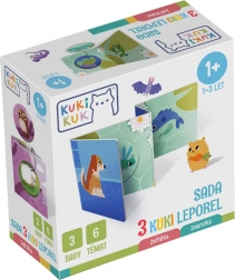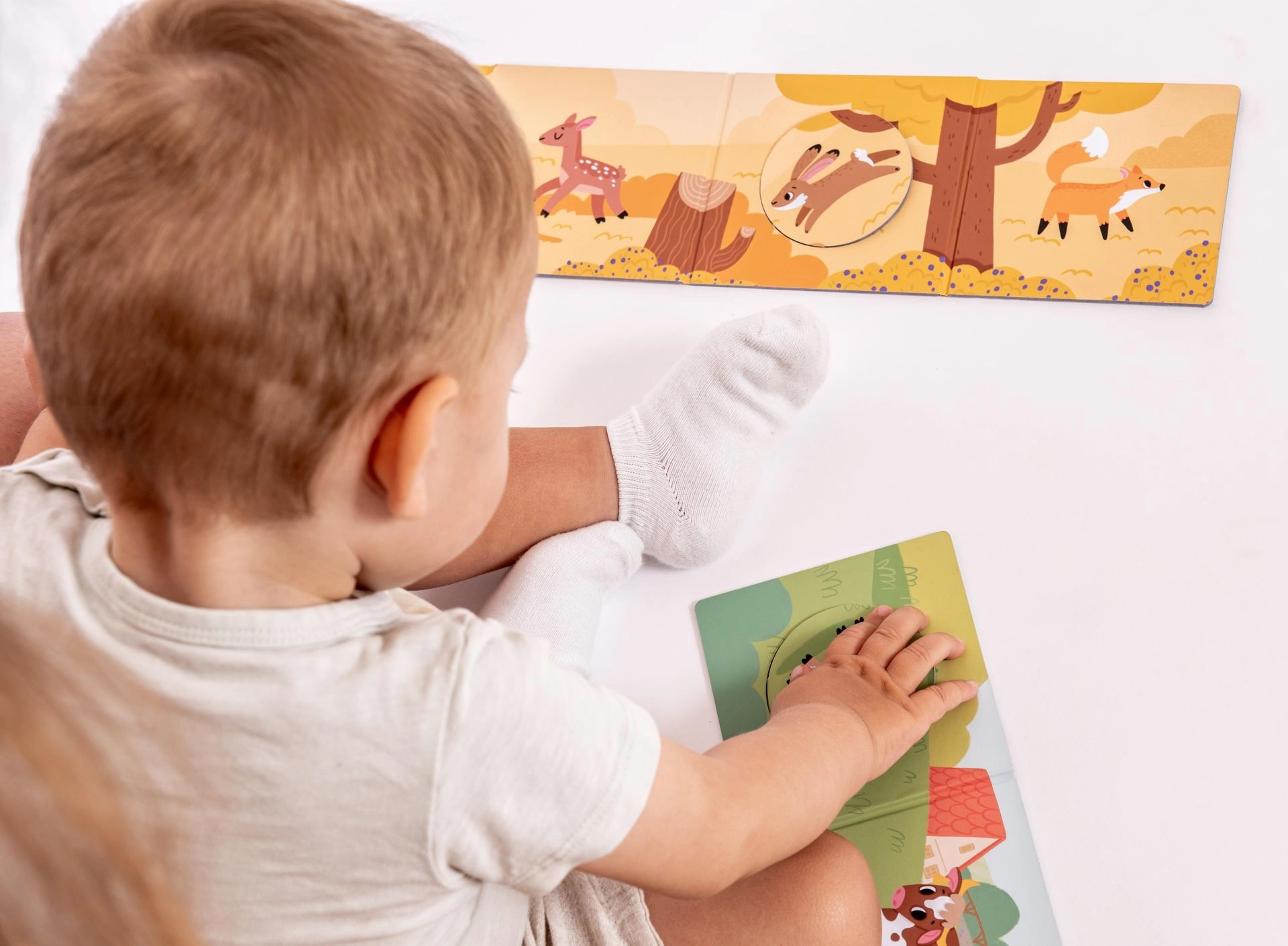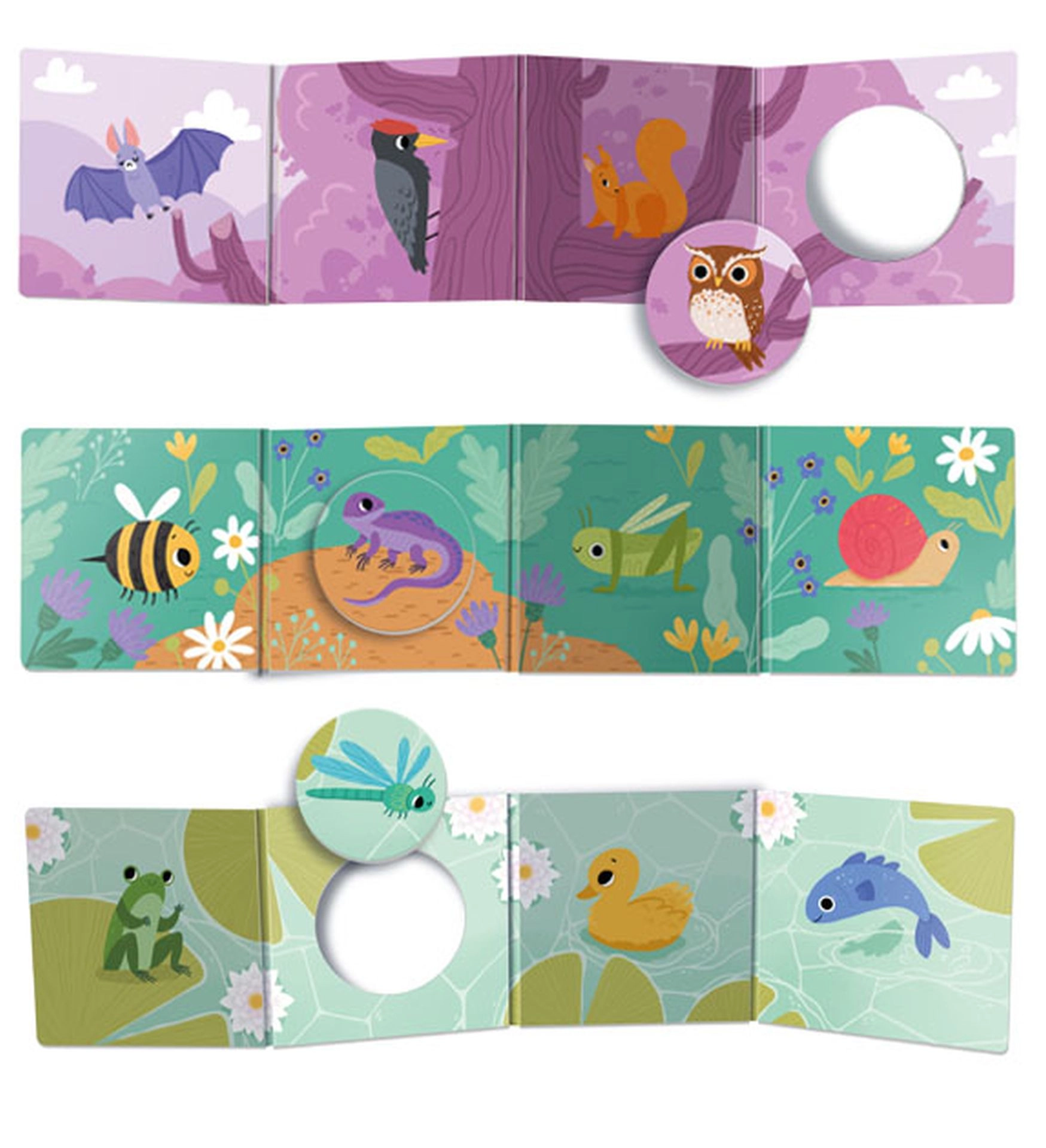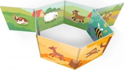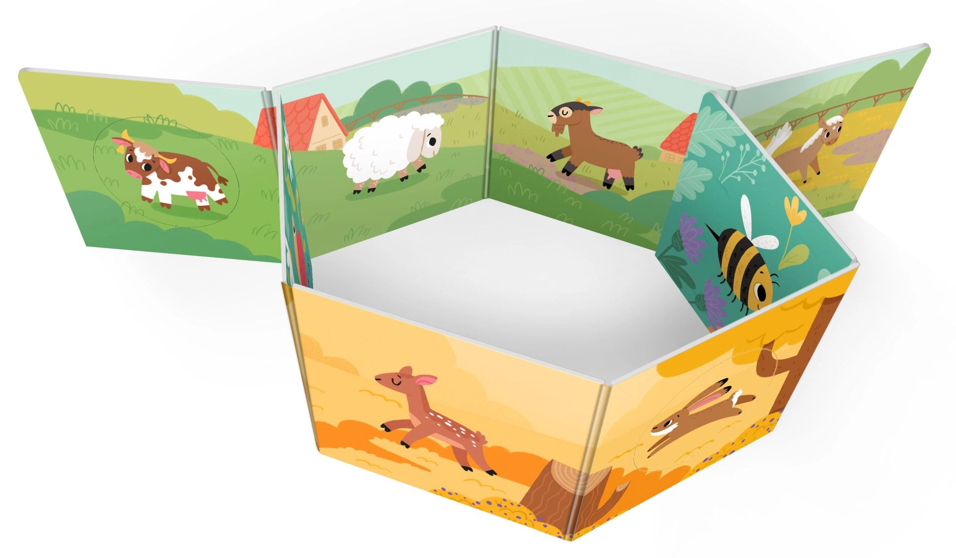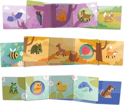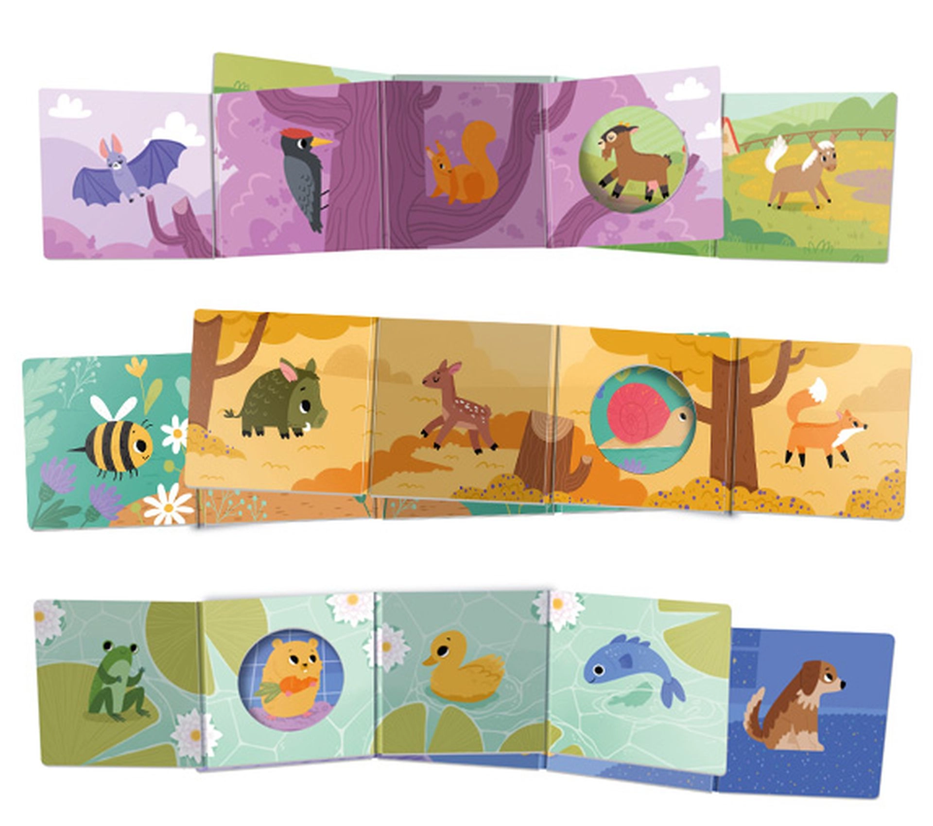 Il set include tre leporelli bifacciali con scene dal bosco, dall’acqua, dal prato, dalla fattoria e altri ambienti. Le pagine robuste in cartone da 2 mm resistono all’uso dei bambini.