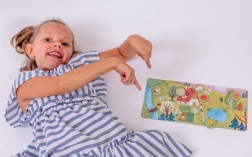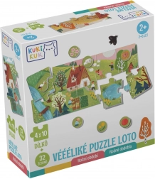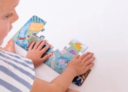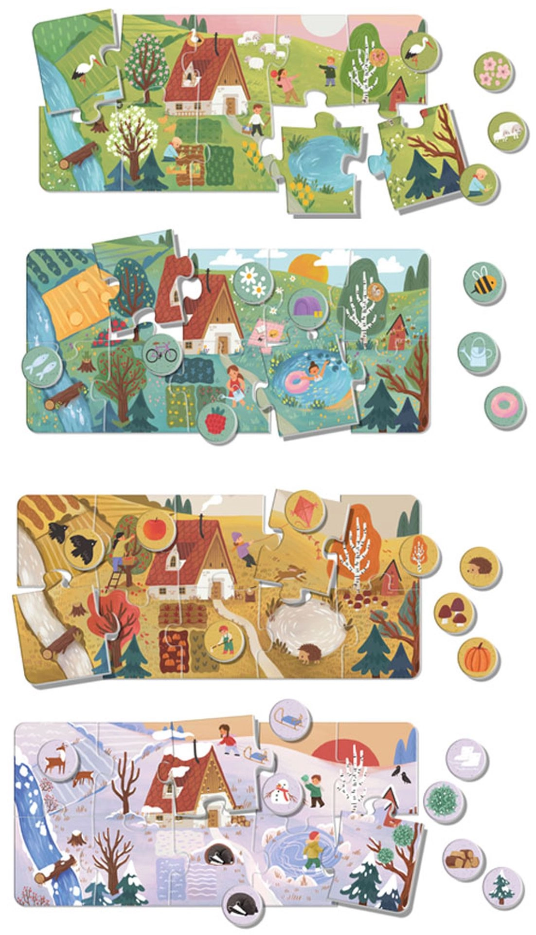 Il grande puzzle loto delle stagioni KukiKuk offre ai bambini quattro splendide scene: primavera, estate, autunno e inverno. Ogni stagione si compone di 10 grandi pezzi che i bambini assemblano, per poi abbinare 8 gettoni rotondi con motivi caratteristici. Seguendo i principi Montessori, i bambini scoprono autonomamente, classificano e collegano gli elementi attraverso la percezione sensoriale.