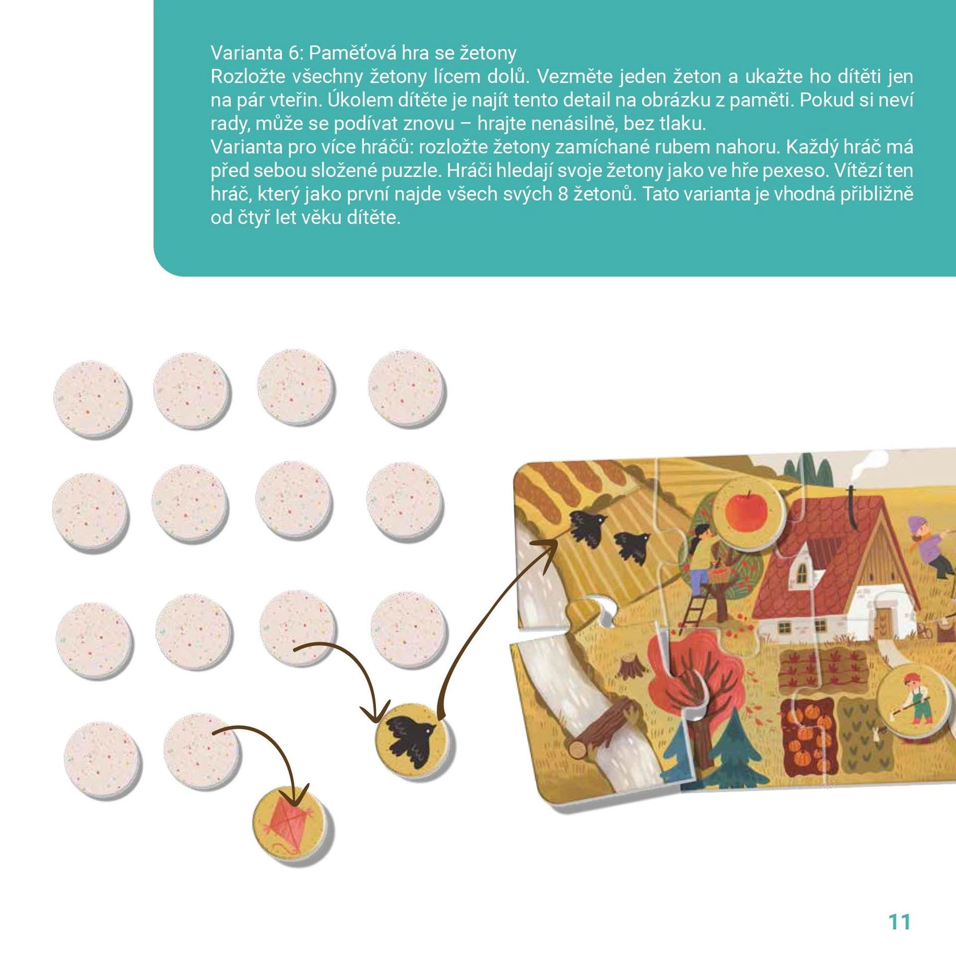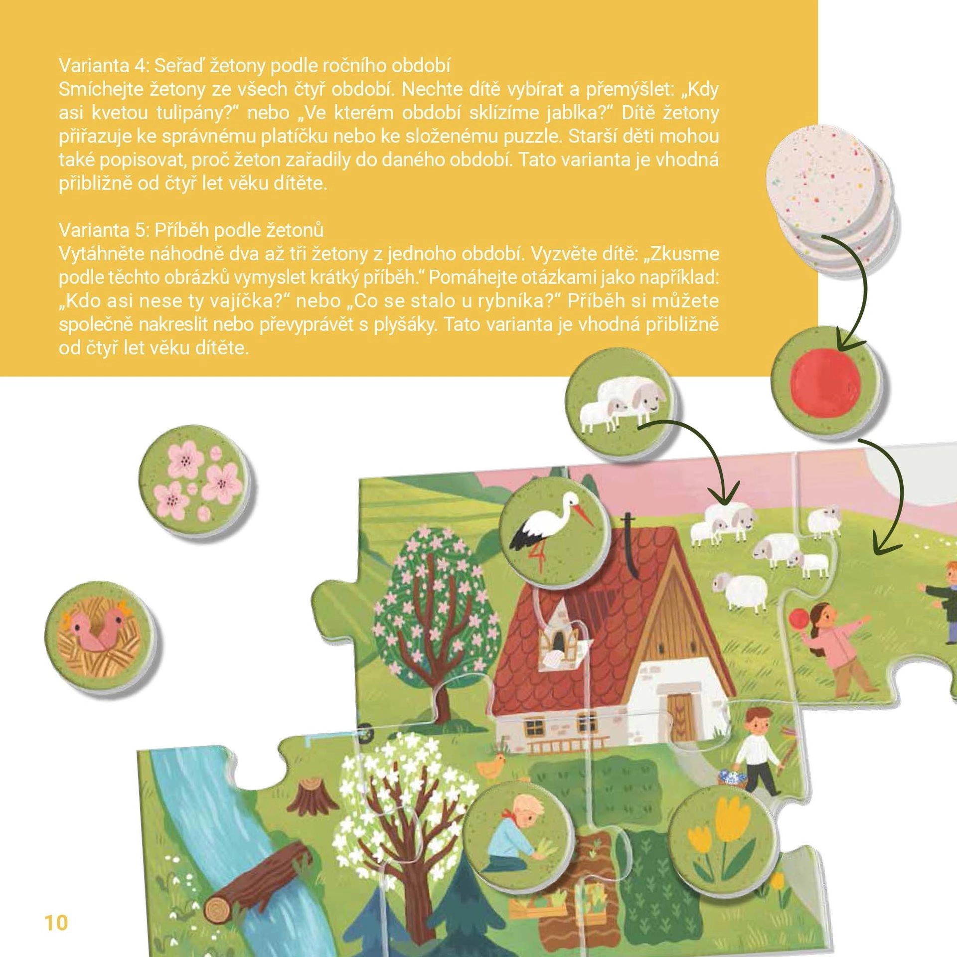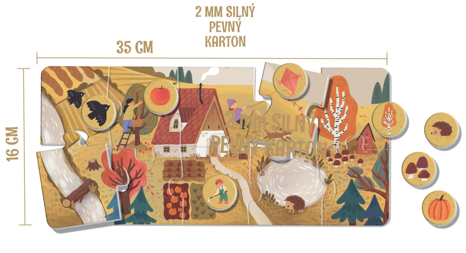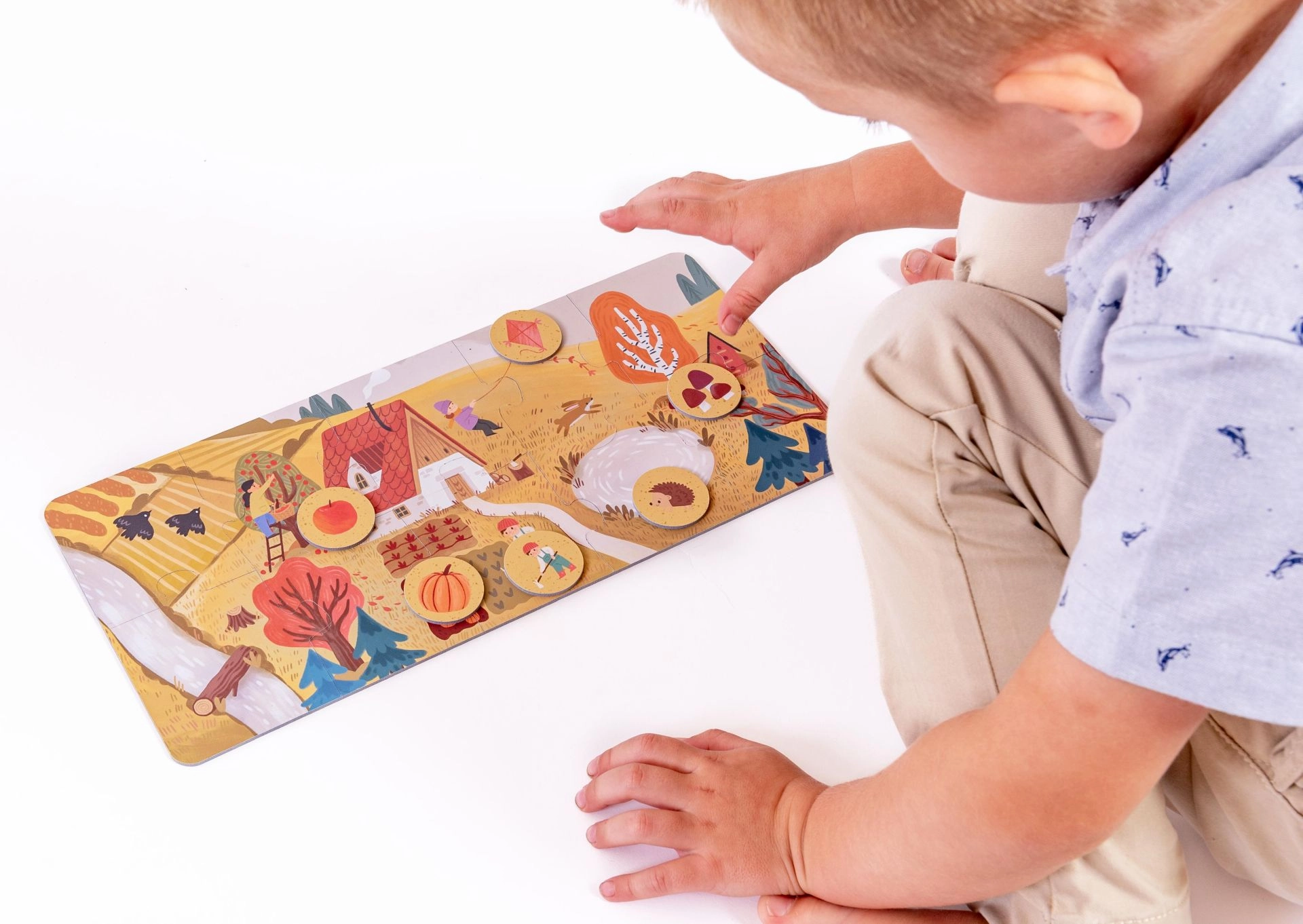 Il gioco è progettato per le manine: i pezzi extra grandi in cartone FSC da 2 mm sono resistenti, facili da afferrare e completamente senza plastica. L’apprendimento avviene in modo naturale: i bambini allenano l’attenzione, ampliano il vocabolario e parlano dei cambiamenti in natura durante l’anno.