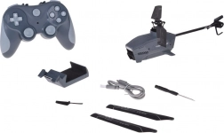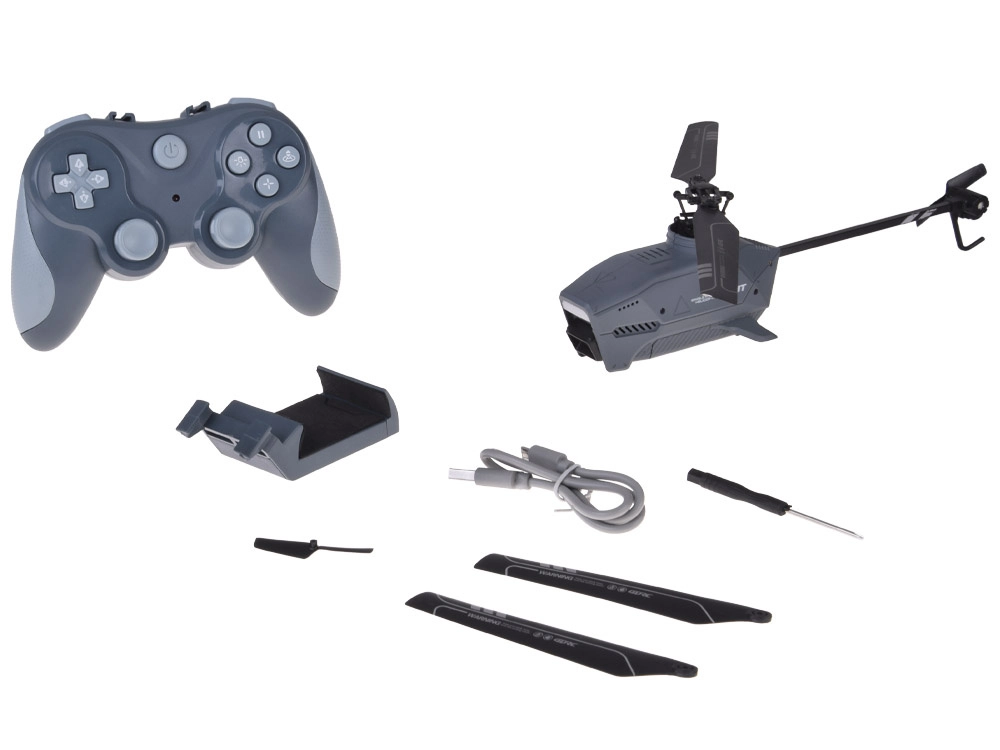 - Elicottero, radiocomando, batteria, cavo USB, pale di ricambio, rotore di coda, supporto per telefono, cacciavite, manuale