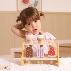 I pezzi rimovibili allenano la presa e la coordinazione. I bambini esercitano comunicazione e immaginazione giocando alla gelateria.