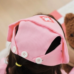 Incluso un cappellino rosa abbinato con croce ben visibile, che sottolinea il ruolo della piccola infermiera.