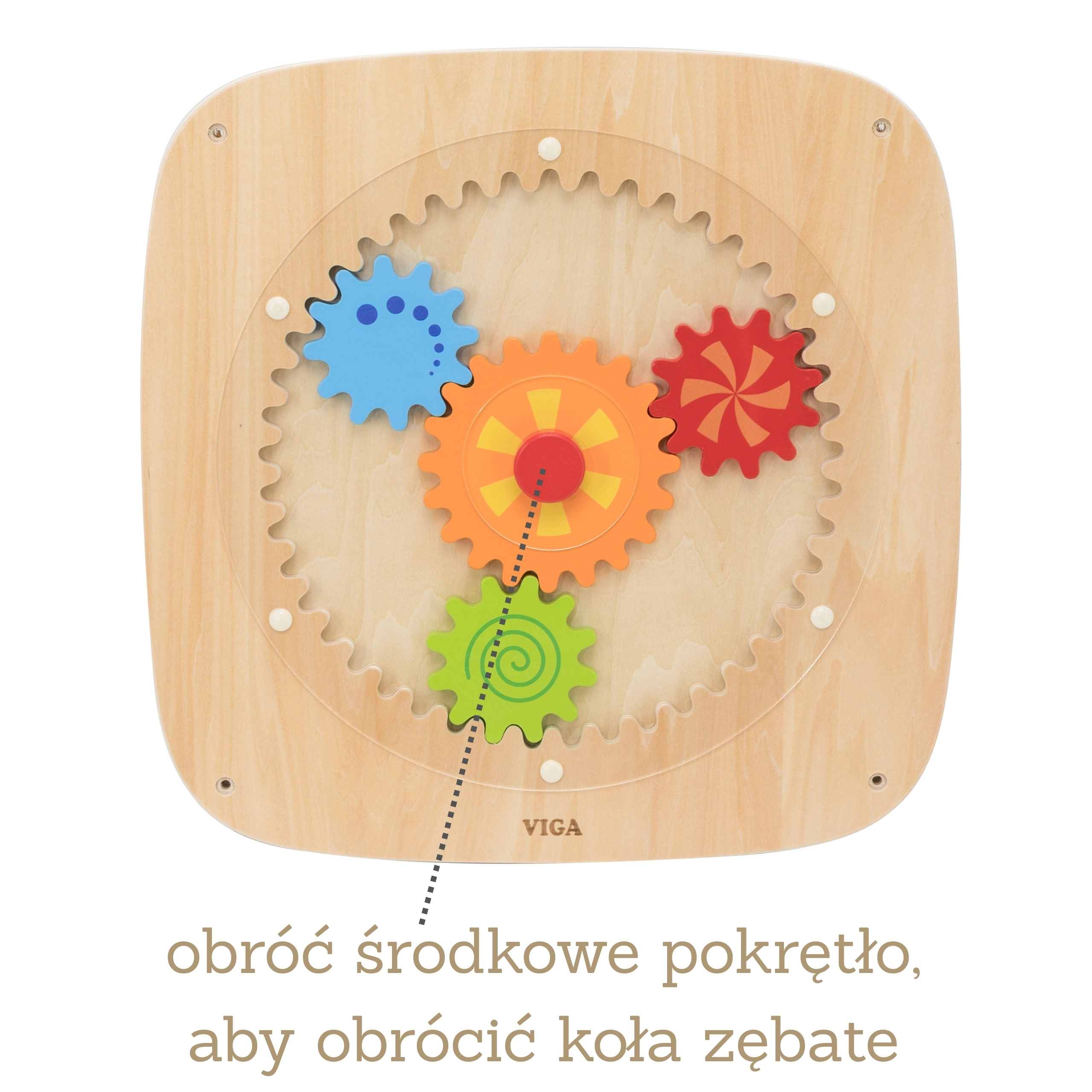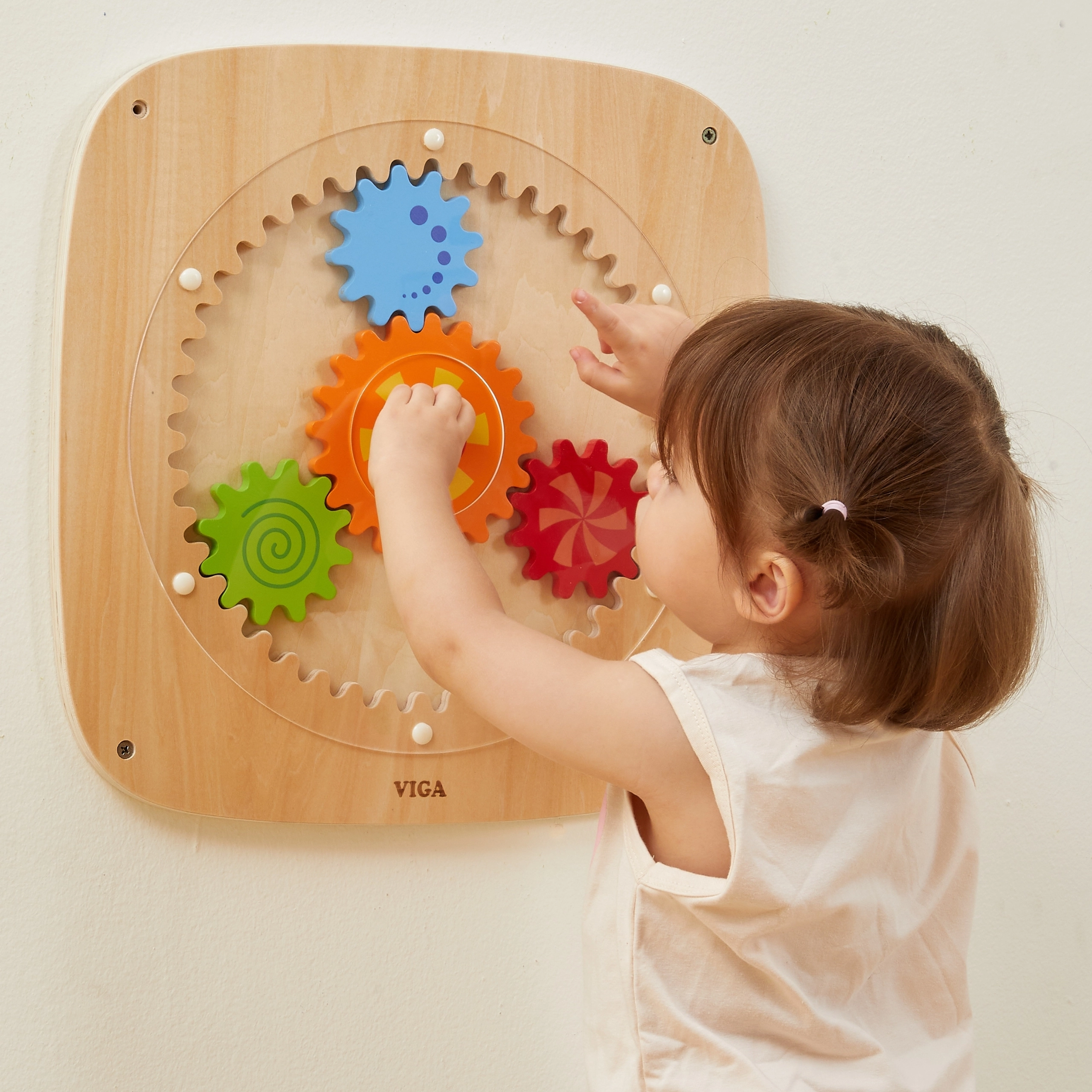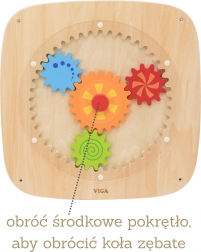 Questa lavagna da parete in legno con ingranaggi colorati è progettata per offrire ai bambini la gioia della scoperta. Ruotando la ruota centrale, tutti gli ingranaggi si mettono in moto contemporaneamente, mostrando in modo naturale ai bambini il principio della forza, del movimento e delle relazioni di causa. I vari colori e motivi sulle ruote creano attraenti effetti visivi durante la rotazione.