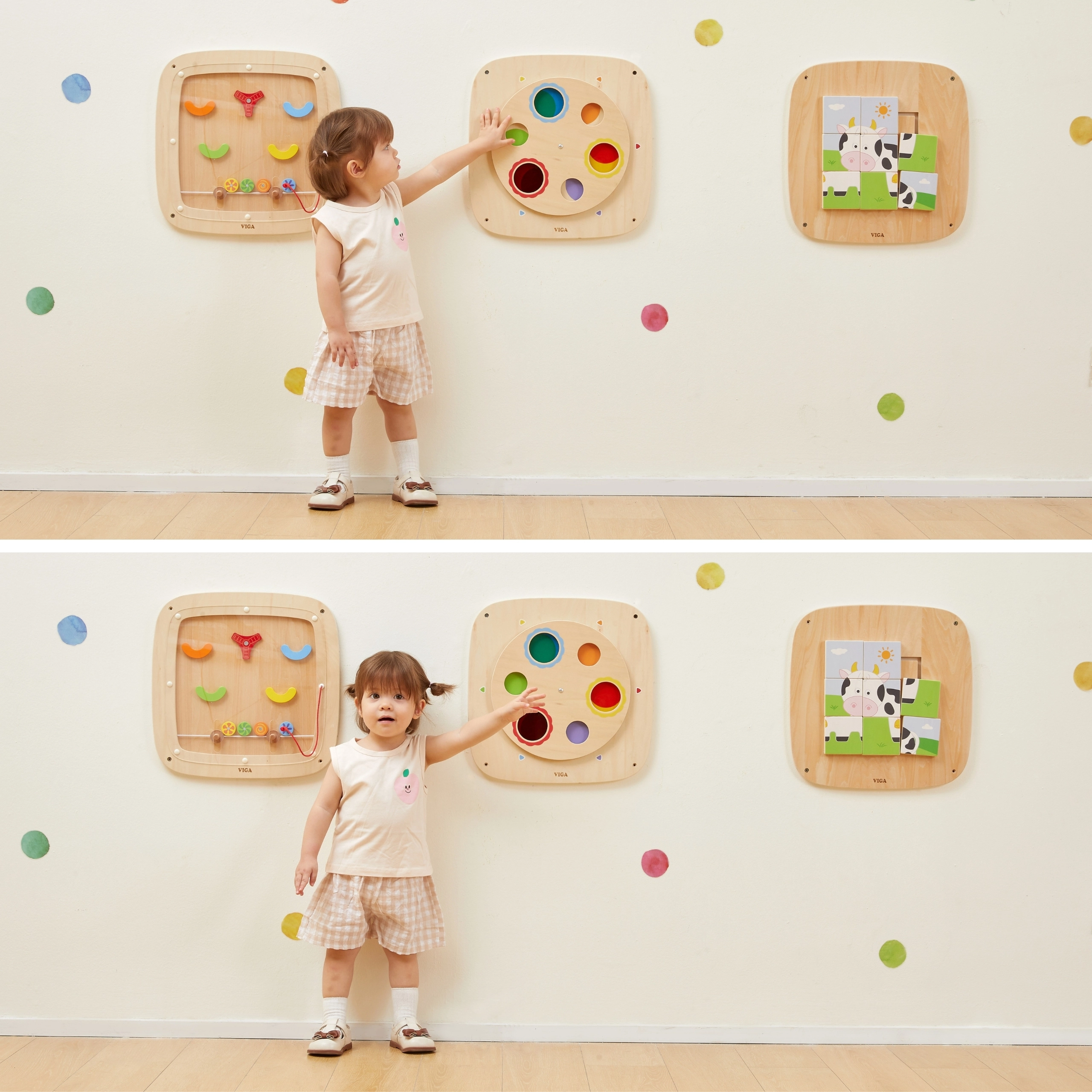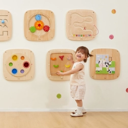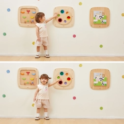 Grazie all’installazione a parete, il pannello è ideale per stanze piccole, asili e angoli gioco: non occupa spazio a pavimento ed è sempre pronto per un gioco sicuro. Materiali durevoli e di qualità, insieme a finiture lisce, garantiscono una lunga durata anche con uso quotidiano.