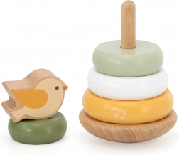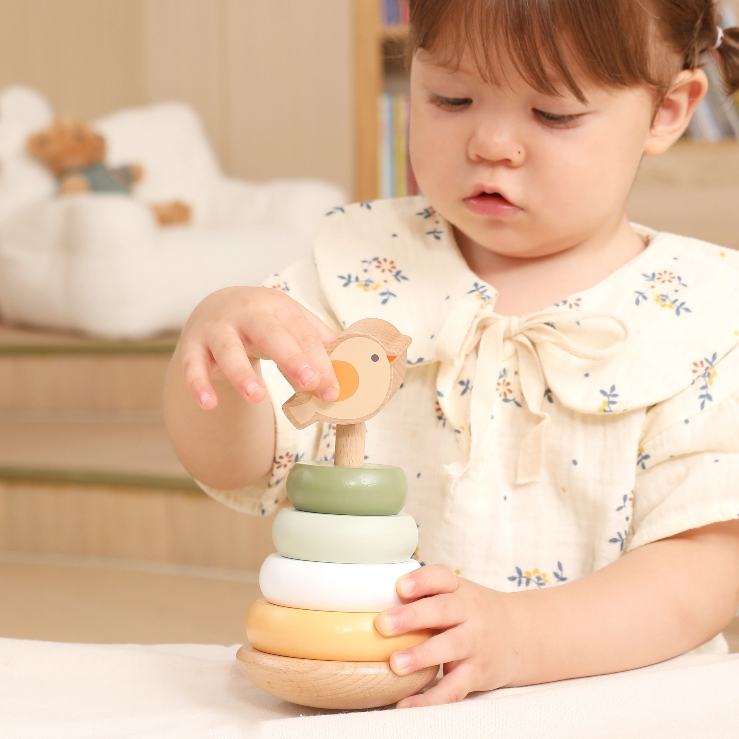 La torre impilabile in legno con il simpatico uccellino in cima farà felice ogni bimbo. Gli anelli colorati con bordi lisci sono facili da afferrare e impilare in vari ordini, favorendo il riconoscimento di colori e dimensioni e la risoluzione dei problemi. La base stabile e le forme piacevolmente arrotondate garantiscono una manipolazione sicura per le piccole mani.