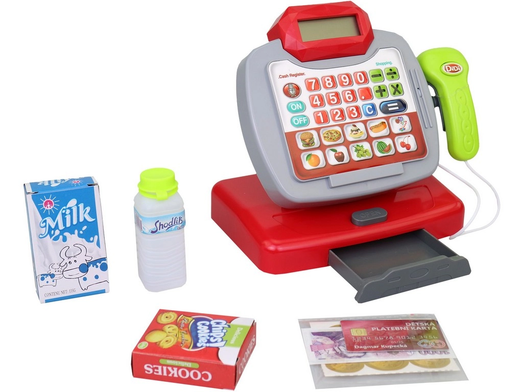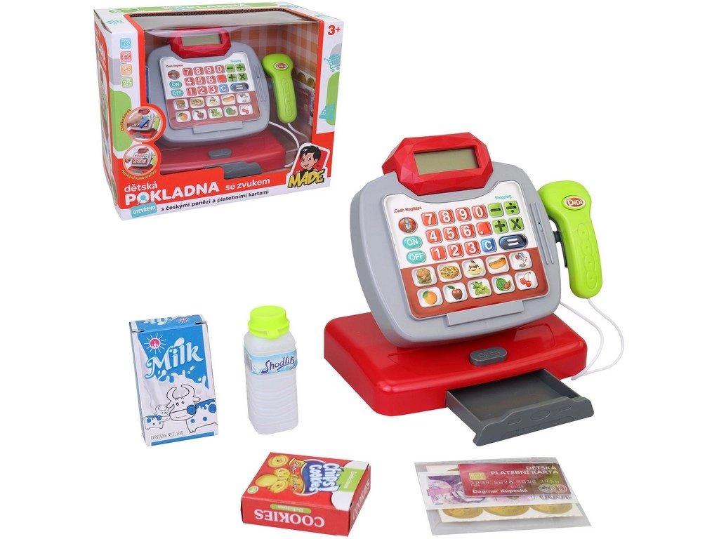 Il set include numerosi accessori: banconote ceche, monete di plastica di vari valori e carte di pagamento. I bambini possono così esercitarsi nel calcolo e nelle abitudini di pagamento in modo divertente. La robusta struttura in plastica garantisce resistenza nell’uso quotidiano.