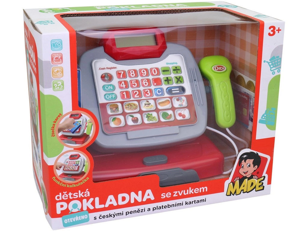 La cassa giocattolo con design ceco farà felici tutti i piccoli commessi. Offre effetti luminosi e sonori, uno scanner funzionante per la lettura dei prezzi, una calcolatrice digitale e ricchi accessori, tra cui banconote ceche, carte di pagamento e monete di plastica. L’alimentazione è garantita da 2× batterie AA (incluse). Adatta ai bambini da 3 anni.