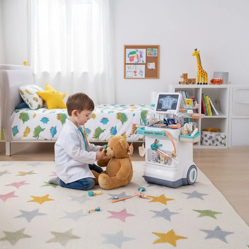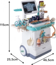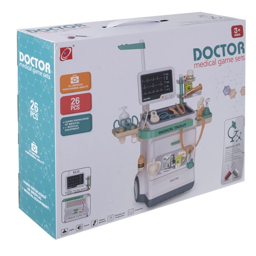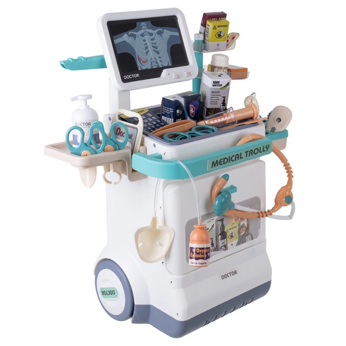 La stazione medica per bambini su carrello mobile a due livelli con schermo ECG/RX e ricca dotazione porta a casa un realistico gioco del dottore. Gli effetti luminosi e sonori (battito, segnale ECG) stimolano la curiosità e avvicinano al funzionamento dell’ambulatorio.