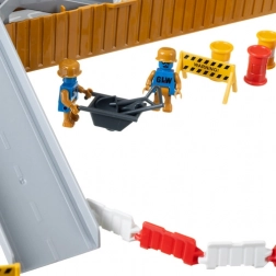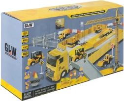 - Contenuto del set: TIR con piattaforma apribile, gru a torre, betoniera, rullo stradale, carrello elevatore, escavatore cingolato, pala caricatrice, dumper, 2 omini, coni, barriere, segnali, barili, nastri, carriola e pala.
