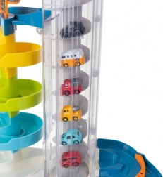 Questa colorata autorimessa porta ai bambini un gioco dinamico con le macchinine: sollevale con l’ascensore manuale o elettrico ai piani superiori e guardale tornare giù velocemente lungo le piste a spirale. Grazie ai cinque livelli c’è molto spazio per correre, parcheggiare e creare situazioni di traffico personalizzate.