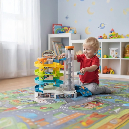 Un ampio playset multilivello con discese fluide e aree di parcheggio che stimola fantasia, motricità fine e il gioco di più bambini contemporaneamente.