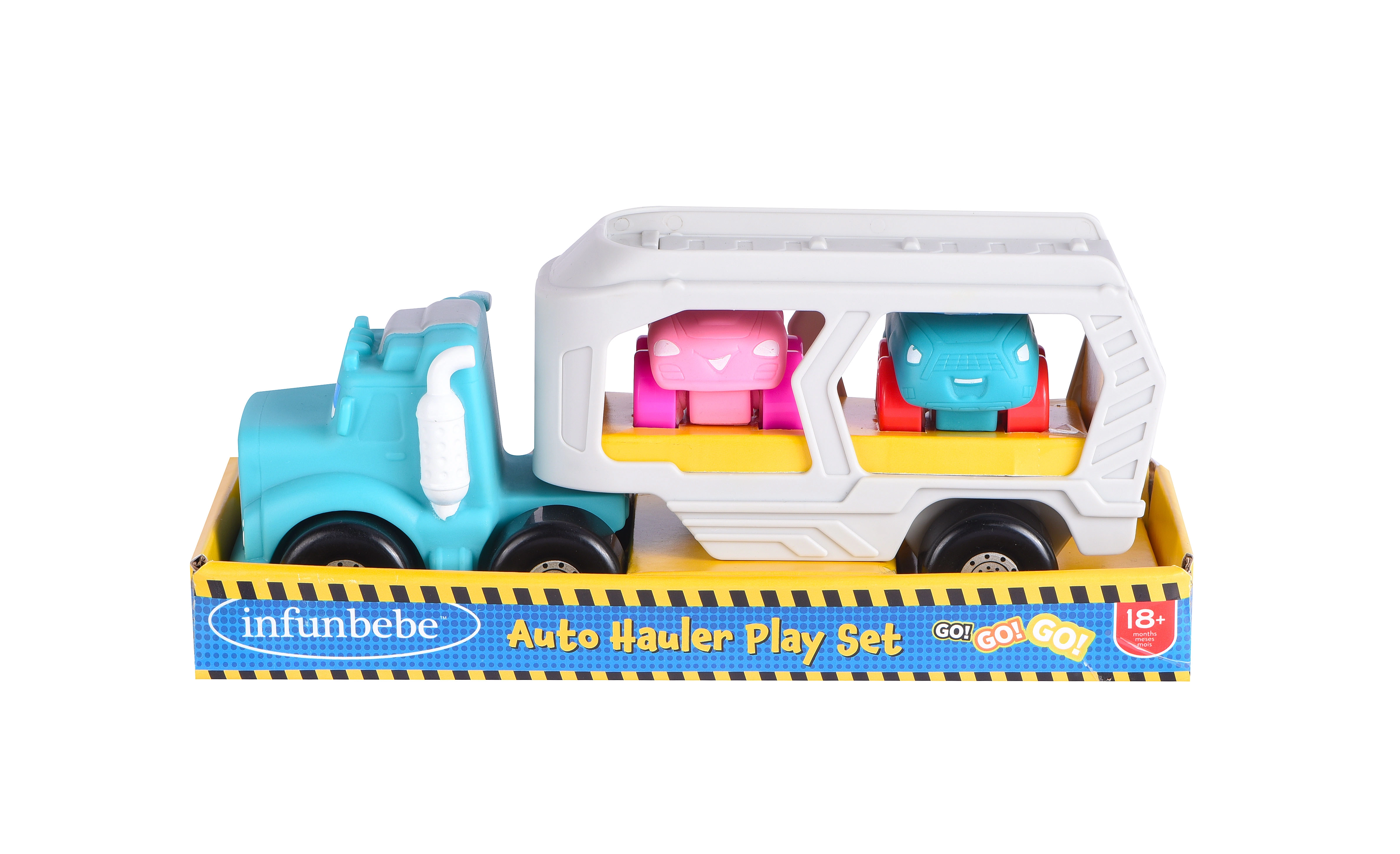 La confezione include una bisarca e due auto, che si possono caricare e scaricare con facilità. La struttura leggera e resistente è adatta all’uso quotidiano e al trasporto agevole.