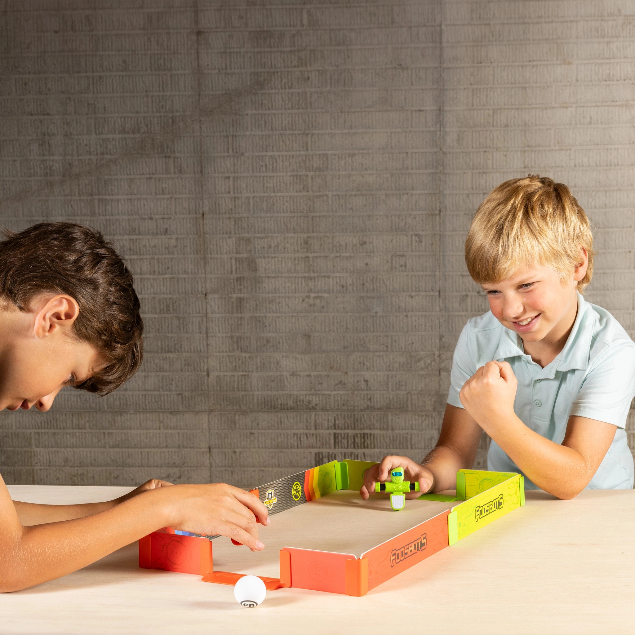 Foosbots battaglia da stadio porta in salotto l’azione scattante del calcio da tavolo in formato tascabile. Grazie alle sponde colorate, alle porte integrate e alla coppia di robot da dito, avvii facilmente un uno contro uno. Controlla i tuoi “bot” con dita agili, tira la pallina bianca e difendi la porta a ritmo fulmineo.