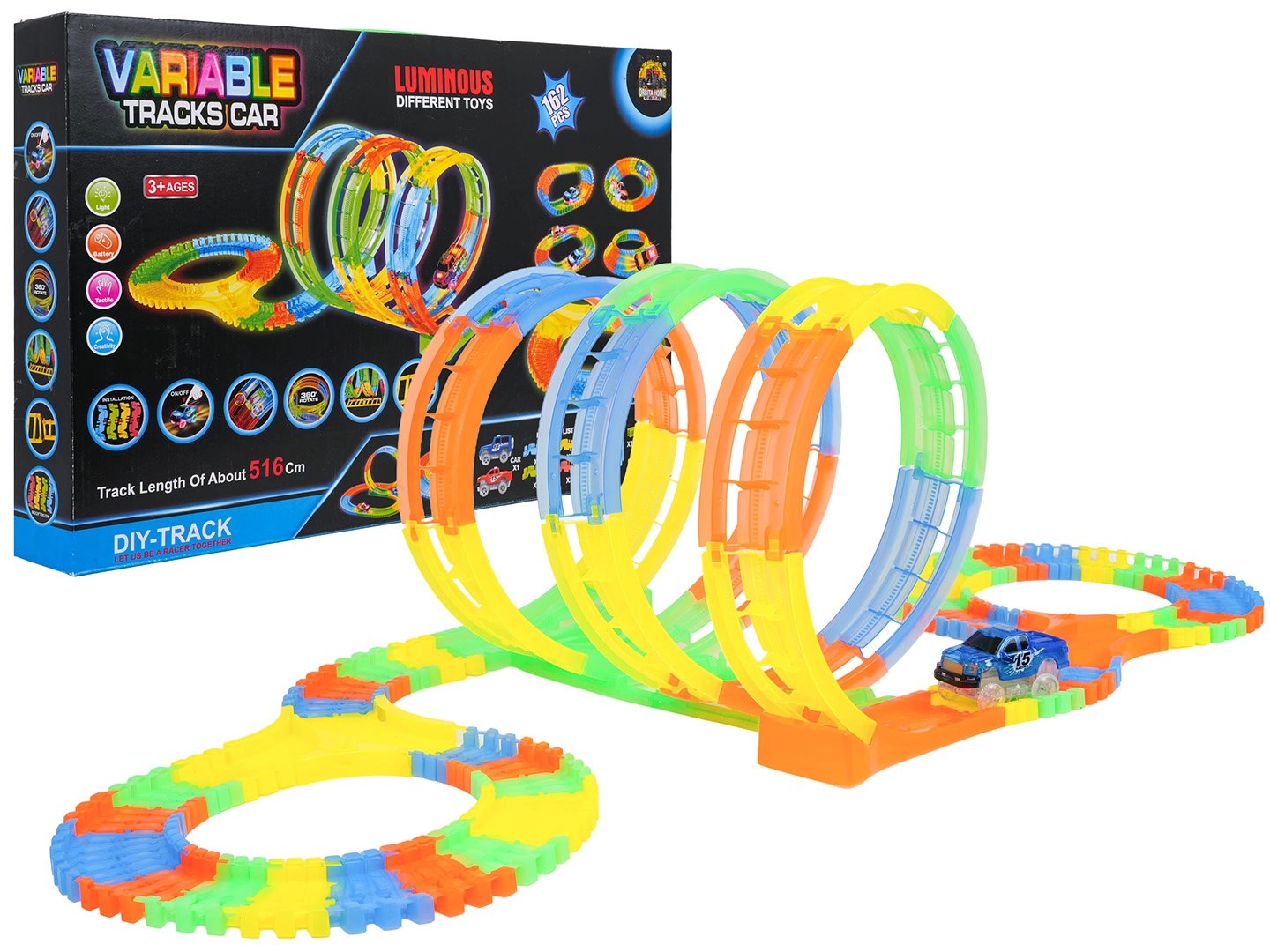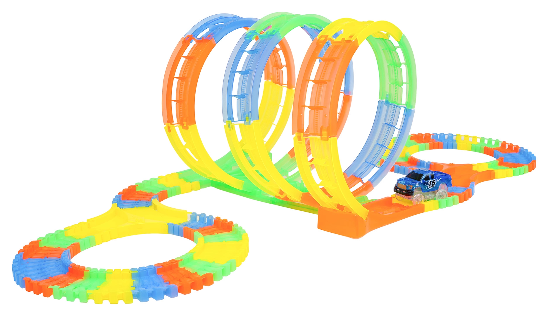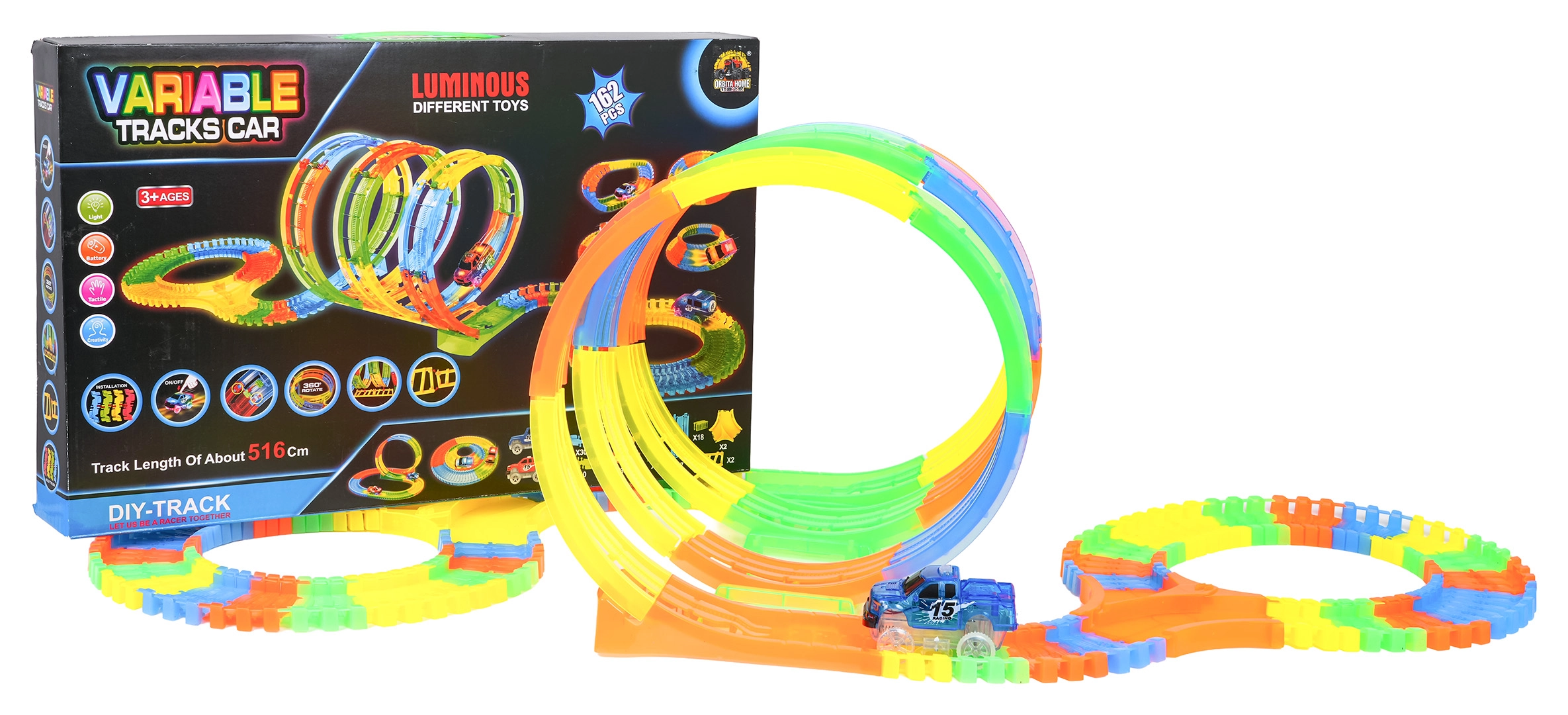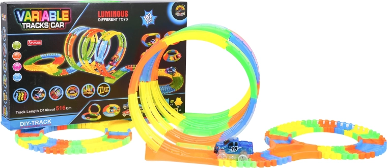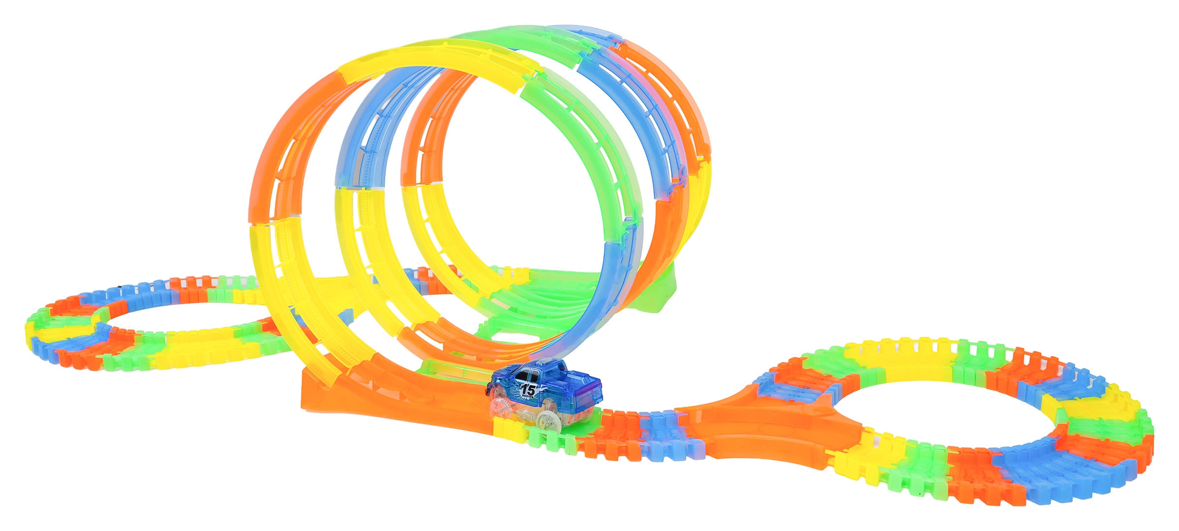Regalate ai bambini un divertimento senza fine con la pista da corsa con 162 pezzi, flessibile, luminescente al buio e con macchinina a LED. I pezzi si incastrano facilmente in varie forme e loop, così i piccoli piloti dai 3 anni possono creare piste personalizzate e godersi acrobazie con un suggestivo effetto luminoso.