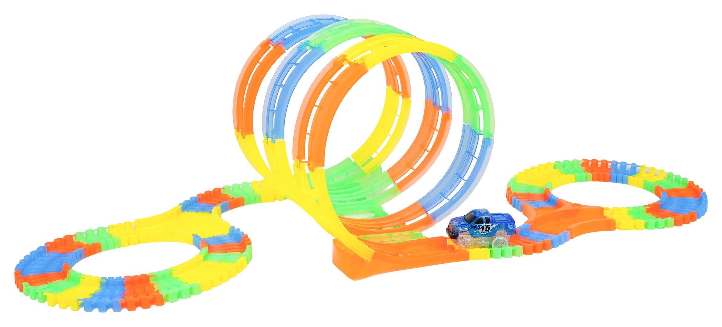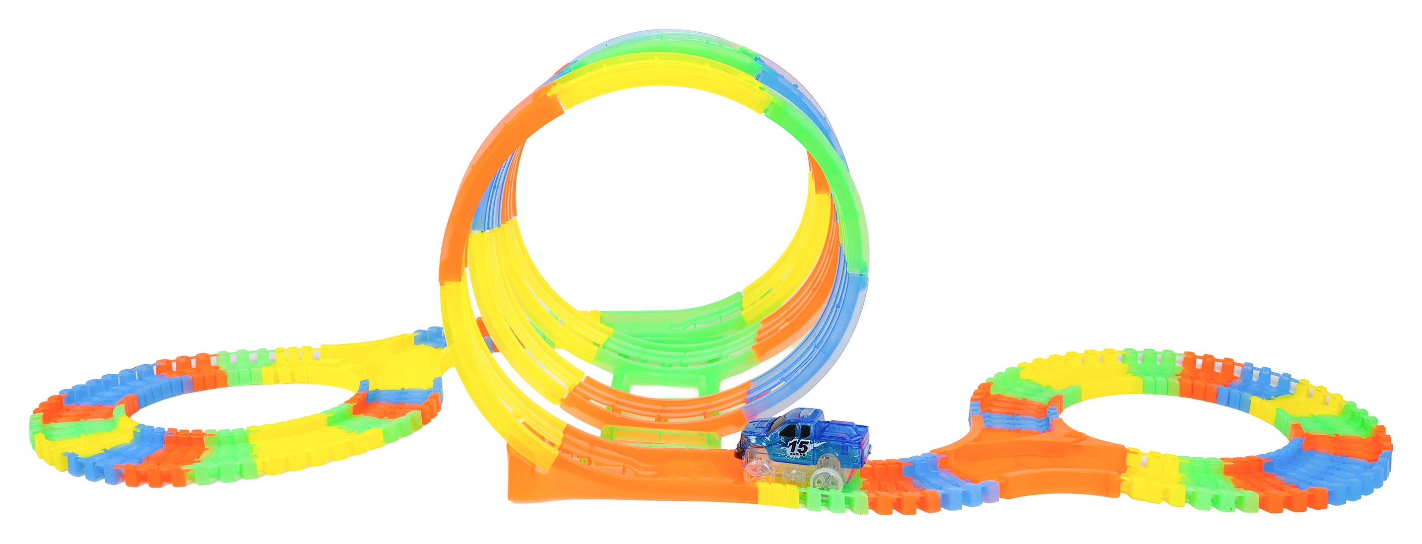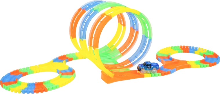 Questa pista colorata offre ai bambini costruzioni creative e una guida dinamica. Grazie ai pezzi elastici a incastro, in pochi istanti nascono loop, curve e ponti che si possono modificare in qualsiasi momento, anche durante la corsa. La finitura fluorescente della pista e la retroilluminazione LED della macchinina regalano uno spettacolo di luci al buio.